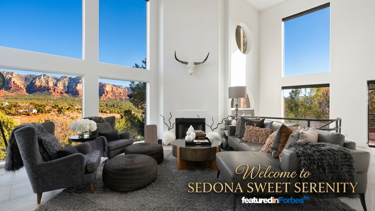 Welcome to Sacred Cliffs, a stunningly remodeled mid-century gem nestled on a cliffside with breathtaking panoramic views of iconic red rock formations and serene Oak Creek. Located just a few miles from Uptown Sedona, hiking trails, shops, and restaurants, and Sacred Cliffs offering a private access to the river, making it a peaceful and convenient basecamp for your Sedona adventure! This 3,200 sq. ft. single-level retreat is perfect for large families or groups seeking comfort and style!