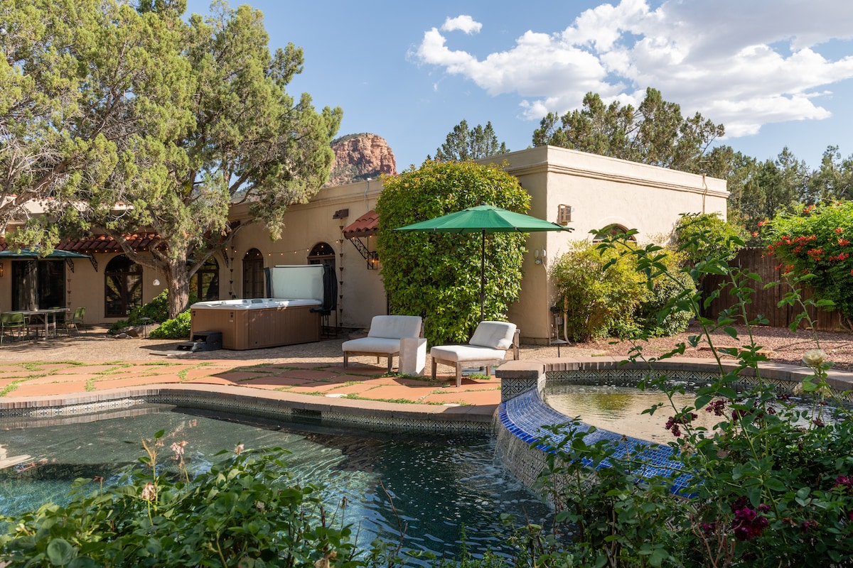 Escape, unplug, and unwind at this one-of-a-kind “living” retreat, designed and built by a local artist and his family. Featured in books, magazines, and local news, this tranquil haven offers a rooftop lawn with breathtaking views of the magical Oak Creek Canyon. Enjoy hiking, swimming, and hot tub stargazing directly from the property. Free-roaming peacocks and abundant wildlife add to the charm. With a koi pond inside, and living gardens this place offers an experience like no other!
