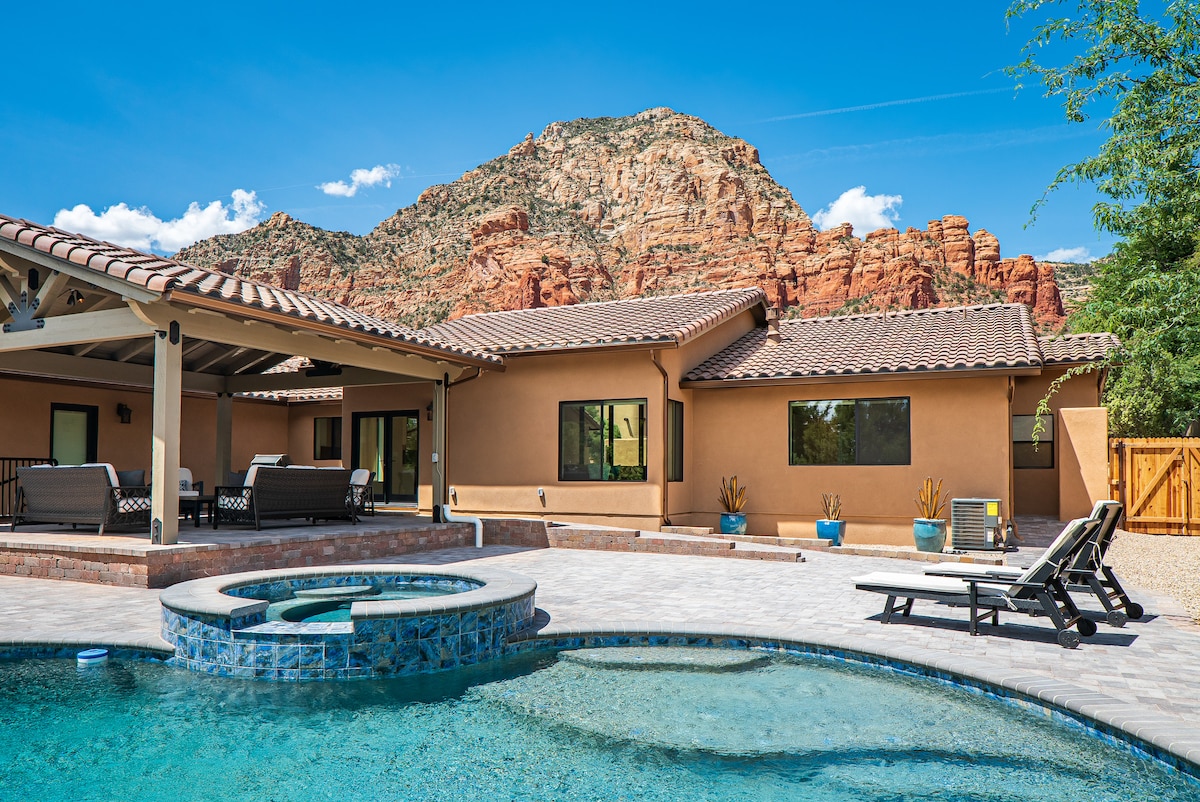 Resort-style home curated with thought and care to create lifelong vacation memories of your stay in Sedona. Enjoy Red Rock & Sunset views inside & out! Huge TV & deluxe BBQ - you got it! Soak or swim in the LED-lit waters of the 12+ foot Hydropool Spa. Three crystal-themed KING bedrooms with 5-star bedding & special touches to elevate your stay. Relax in the Adirondack chairs by the fire. Stargaze from the hammocks. Enjoy one of MANY outdoor games in the big yard & plush sports turf. Welcome!