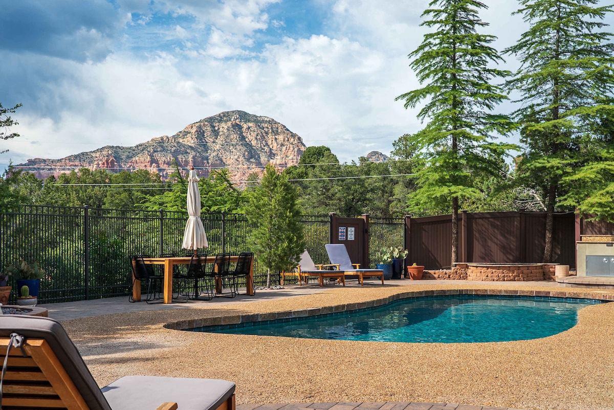 Welcome to your Sedona retreat! A spacious 3,200 sq. ft. mid-century modern home in West Sedona with breathtaking red rock views. Relax in the heated pool, soak in the hot tub, or unwind by the outdoor fireplace under starry skies. Inside, enjoy an open living space, a fully stocked kitchen, and a spa-like rain shower. Watch your favorite films in the private movie theater. With easy access to hiking, dining, and shopping, this home offers the perfect blend of luxury and adventure.