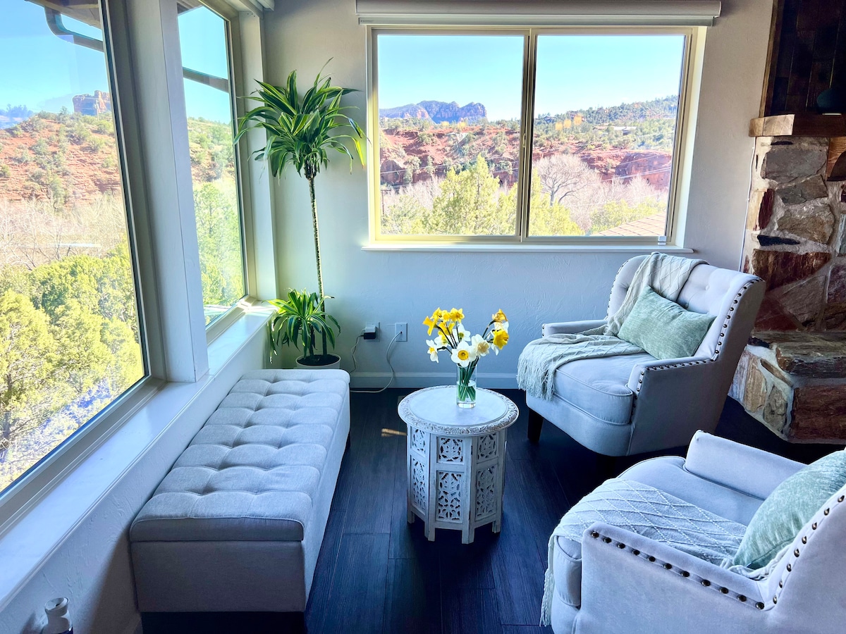 Cradle of the Sun is a charming retreat tucked away in a secluded woodland setting, just minutes from West Sedona and the breathtaking Red Rock State Park. This warm and colorful ground-floor apartment features an open-plan living space with plush seating, a fully equipped kitchenette and dining area, and breathtaking views. The primary bedroom, boasting an electric fireplace, opens onto a spacious terrace for relaxing and taking in unobstructed views of Sedona’s stunning red rock formations.