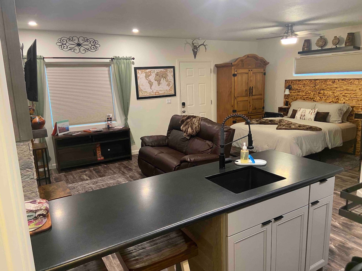 Our artist and gallery inspired guesthouse, hosted by local artist family, features beautiful photos/artwork of Sedona and the surrounding area. It is located in the heart of town, perfectly positioned within walking distance of hiking trails, grocery shopping, and restaurants; and with a few minute drive you can access either end of town. Very quiet getaway, accessed by private road with private driveway and parking, and unlocked via deadbolt keypad. Completely brand new construction/amenities!