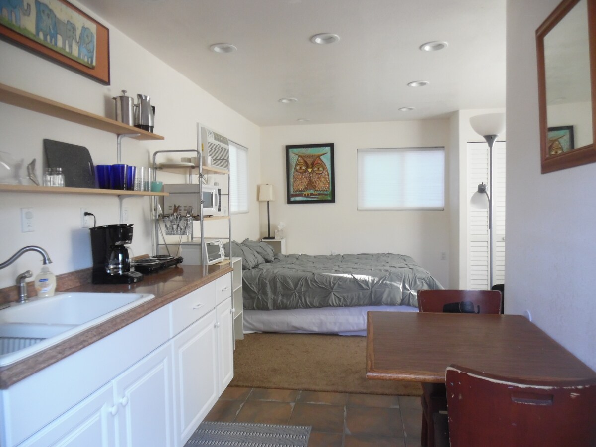 You will immediately feel at home in this one-of-a-kind casita, with its delightfully curated color palette and fabulous architectural design. Natural wood, stone, and metal materials are artfully woven together to create warmth and coziness, while the large windows and soaring ceiling create spaciousness. Prepare coffee or meals in the well-stocked kitchenette, and relax on the outdoor patio surrounded by mature trees. A short walk or drive to Whole Foods, restaurants & trails!