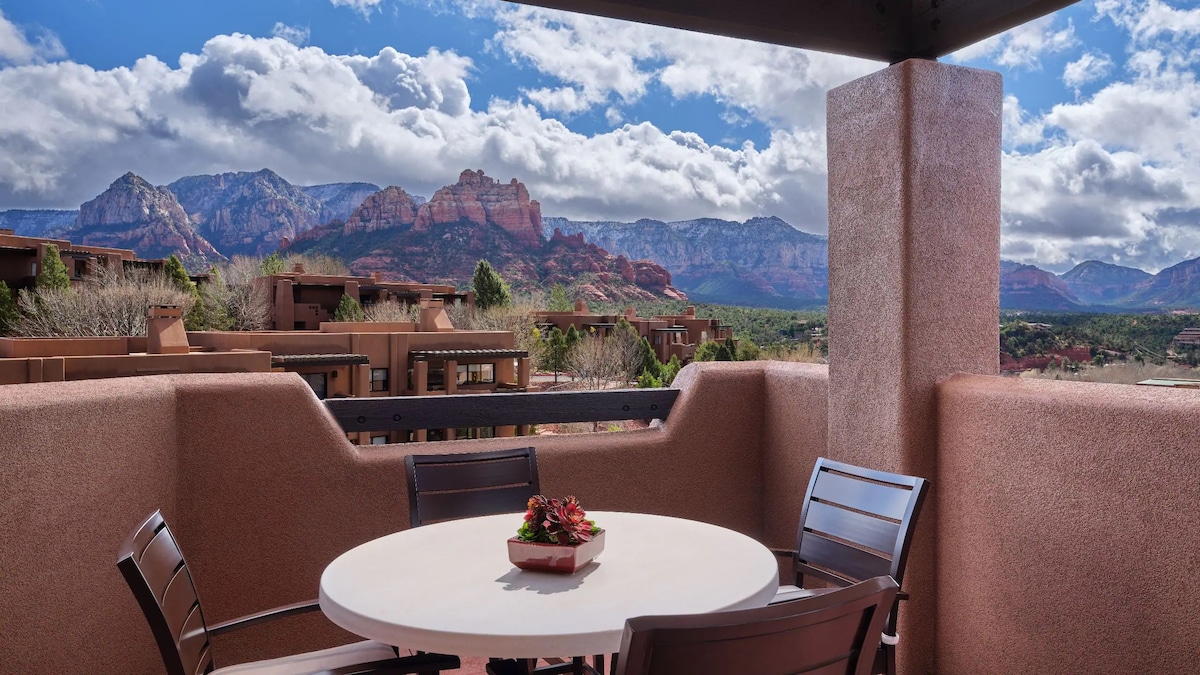 Experience the magic of a Sedona moonrise in the intimate, opulent Gemini Studio. A handcrafted wood bed with premium bedding anchors the space, while a cozy meditation nook invites quiet reflection. The en-suite bathroom boasts a generous rainfall shower, and locally inspired bath products, transforming your evening into a spa ritual. The private balcony offers sweeping views of the star-drenched sky and spectacular northern red rock vistas, including majestic Thunder Mountain.