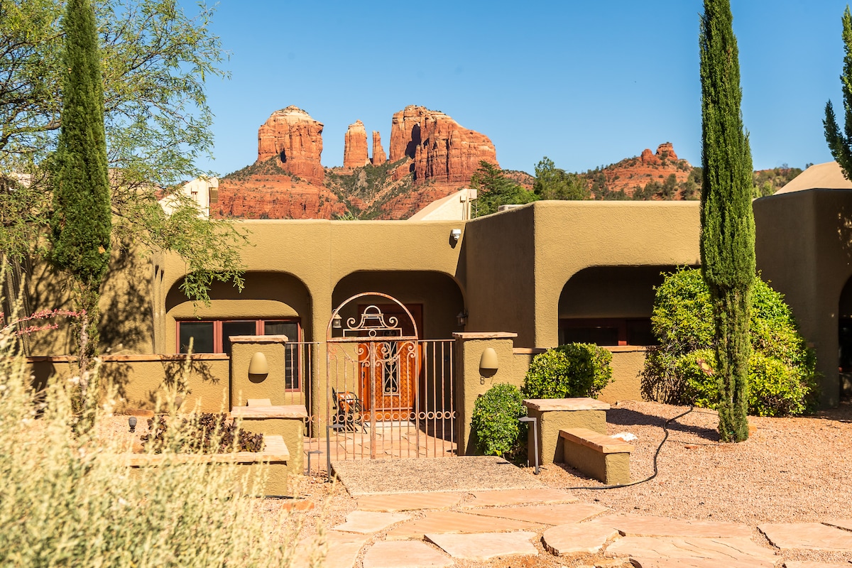 As featured in Vogue, a 5 acre, secluded mountaintop estate. 360º red-rock vistas, gated, private Outdoor pool with panoramic mountain views Fire-pit for star-gazing Five spacious bedrooms with luxe linens Chef-ready kitchen seats 10 6 person hot tub Wake above the clouds, explore Sedona’s trails, then plunge into the pool at sunset. Rose garden/waterfall courtyard, koi pond, stargazing, stationary bike. Otherworldly. Minutes to shopping, restaurants & hiking! Book now. No events allowed.