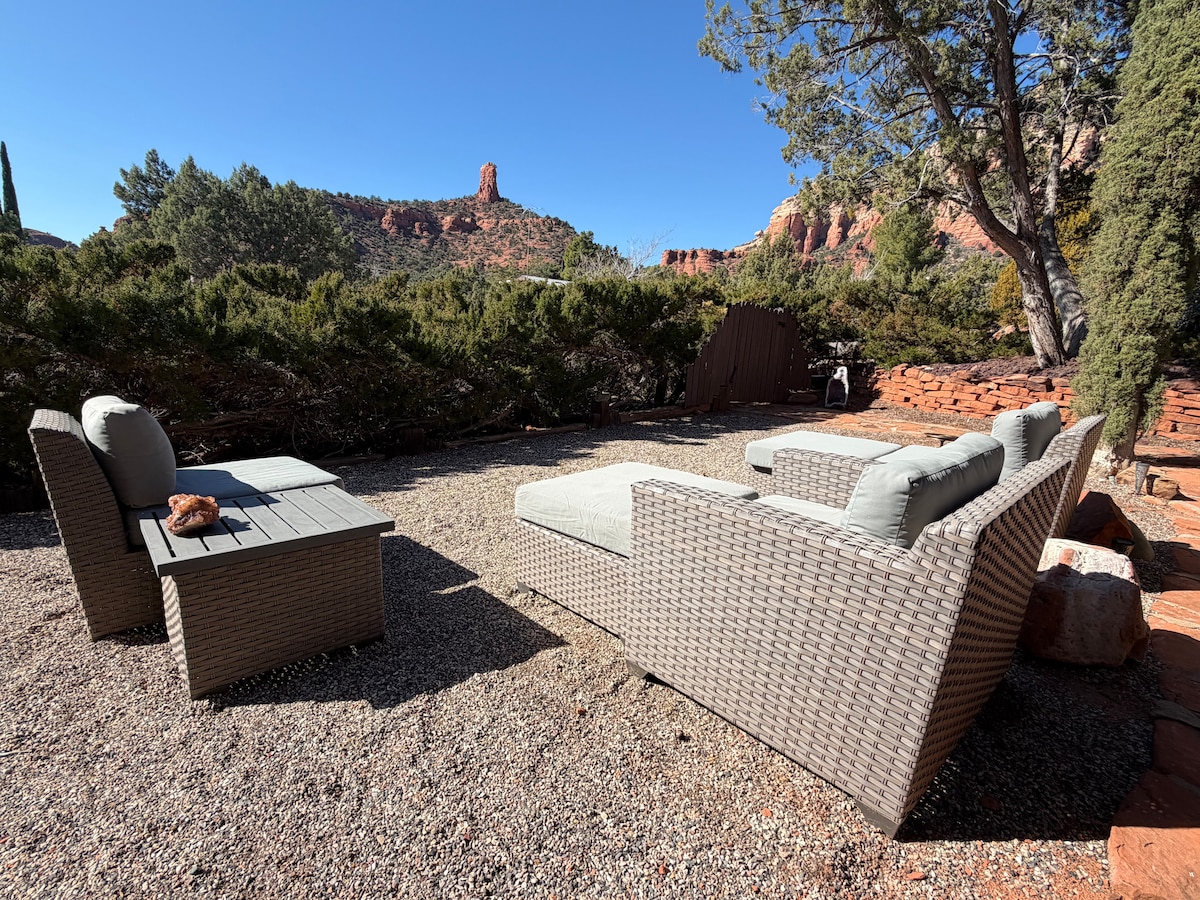 Relax in a serene, self-contained, private guest suite with kitchenette and ensuite bathroom in a quiet neighborhood close to shopping and trails in owner-occupied home. Private patio entrance with THREE private, comfy outdoor seating spaces, one with fire pit--Great for morning coffee and night time stargazing! Ideal location in West Sedona near Trailheads, Restaurants, Spas, Coffee Shops, Peace Stupa, Grocery Stores, Shuttle bus stop! Due to allergies, we cannot accommodate support animals.