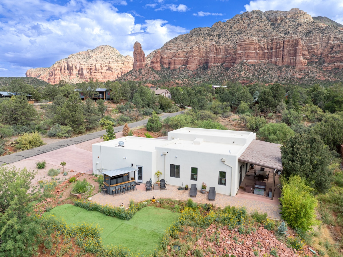 Resort-style home curated with thought and care to create lifelong vacation memories of your stay in Sedona. Enjoy Red Rock & Sunset views inside & out! Huge TV & deluxe BBQ - you got it! Soak or swim in the LED-lit waters of the 12+ foot Hydropool Spa. Three crystal-themed KING bedrooms with 5-star bedding & special touches to elevate your stay. Relax in the Adirondack chairs by the fire. Stargaze from the hammocks. Enjoy one of MANY outdoor games in the big yard & plush sports turf. Welcome!
