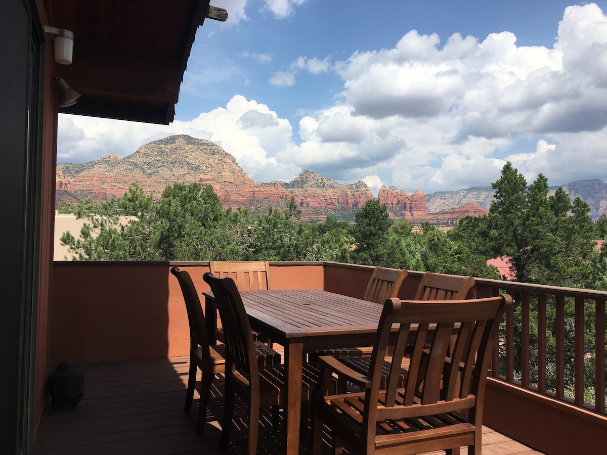 This mountain-top getaway offers magnificent red rock views from every patio and window, as it is built into the side of the famous Airport Mesa. It can accommodate a family or group of up to seven but is also perfectly suited for a couple's vacation. DIRECT BACKYARD ACCESS to the National Forest, leading you to the Airport Mesa trail system. This is one of Sedona’s most beautiful and sought-after areas.