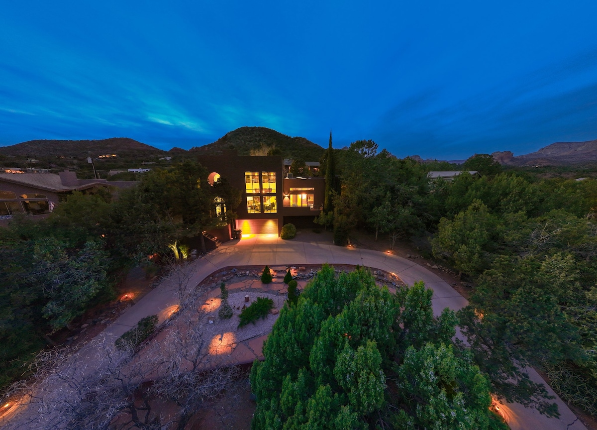 - Marvel at 360° panoramic desert views, including iconic Cathedral Rock. - Discover hidden features, enigmatic art, and secret rooms throughout the home. - Enjoy modern comforts like a game room, with pool table, ping pong, and more. - Easy access to a hiker's paradise and free shuttles to nearby trailheads. - Indulge in a remarkable stay; book now and explore this unique, stylish retreat!