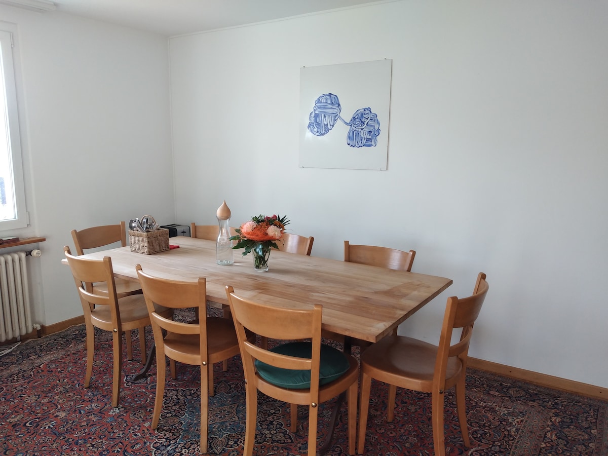 We are delighted to welcome you in an apartment composed of a large living room with fireplace, the mezzanine and an alcove, as well as a bedroom, the kitchen and balcony. Located on the 1st floor of our family home with a pretty garden, this residence is a 9-minute walk from the tourist town center of Morat and a 13-minute walk from Lake Morat. The apartment is furnished and equipped to accommodate a maximum 5 persons.