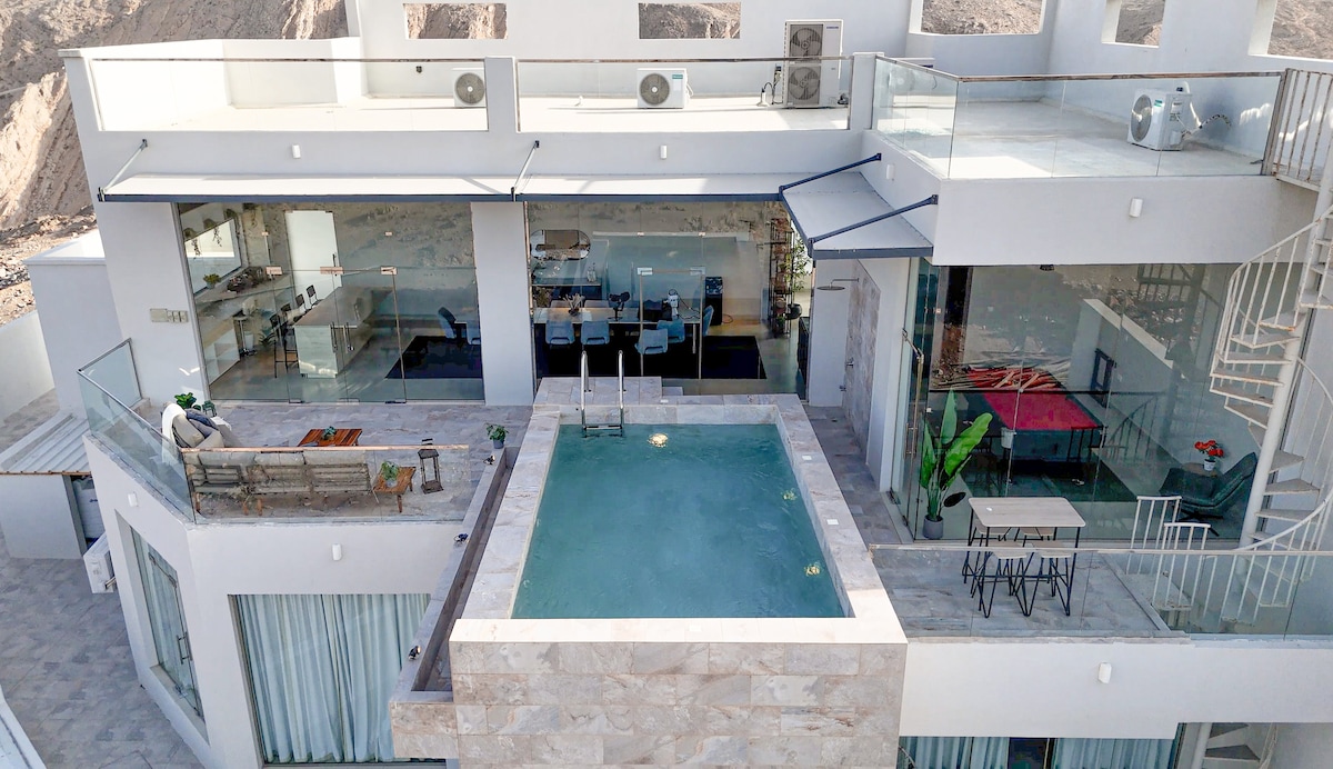A hotel resort dedicated to couples to live a unique atmosphere designed in a unique and modern style to suit your relaxation in different atmospheres It has Private Pool with double hight living room and master room view to swimming pool and living room Swimming pool have temperature control Quite Place and safely 40 Km from Muscat Airport 35 Minutes from Airport