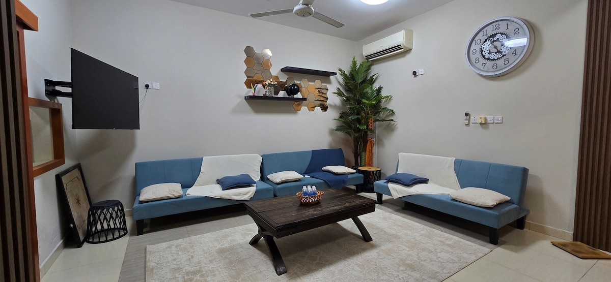 Enjoy peace and relaxation with your family in this peaceful residence. It features a private pool and private parking. It is located 25 minutes from Muscat Airport.There is a Nesto supermarket nearby, just two minutes away. There is also a barber shop, a pharmacy, and a laundry. It is also 15 minutes away from the beach. We provide free daily housekeeping Please keep the place clean There place