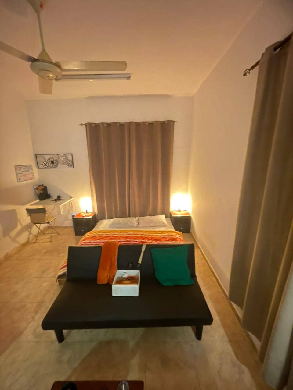 Situated in the prestigious Almouj community, Muscat. • Private Pool • Master Bedroom: • Connected to a private en-suite bathroom. • Direct access to a spacious balcony. • Balcony offers beautiful views of the mosque in Almouj. • Second Bedroom • Sitting Area: Features a cozy couch that can be used as a sofa bed for additional sleeping space. 20 seconds away from the Walk. 10 minute walking distance to a private beach 10 minutes airport Best location in Almouj right by the entrance.