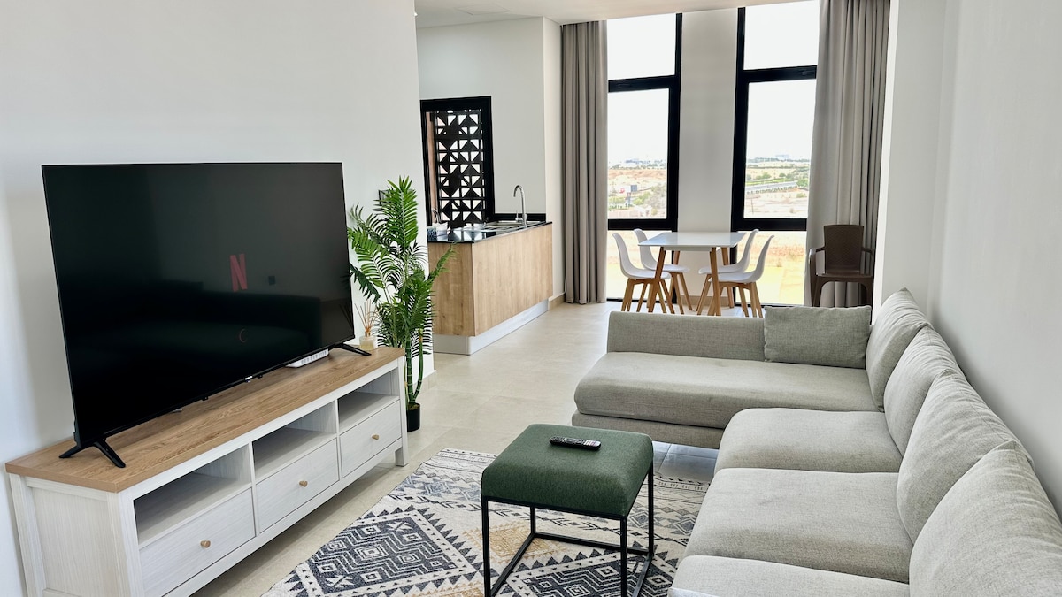 Modern, cozy apartment in Al Mouj, Muscat’s most vibrant and luxurious area. Enjoy a large balcony with stunning marina and infinity pool views. One bedroom with a queen bed, living room with a sofa bed, spacious bathroom with bathtub. Access to gym and pool included. Brand new space, fully furnished with care. Perfect for relaxing stays near cafes, shops, and the sea.