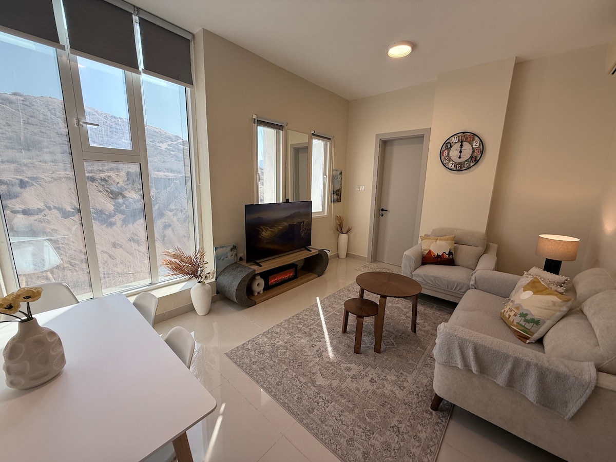 New 1 Bd flat with balcony, living area & 2 toilets.Nice furniture. Equipped with high speed WiFi, bed and dressing,sofa, 50 inch smart TV, satellite and free Netflix access, iron machine, hair dryer,vacuum cleaner, duct AC, ceiling with LED spot lights . You can enjoy the free swimming pool, gym & kids playground and BBQ cooking area. 5min drive from shopping malls, 15-20min from airport. 20min drive from beach, 20min drive from the old Market, next to sand dunes view.