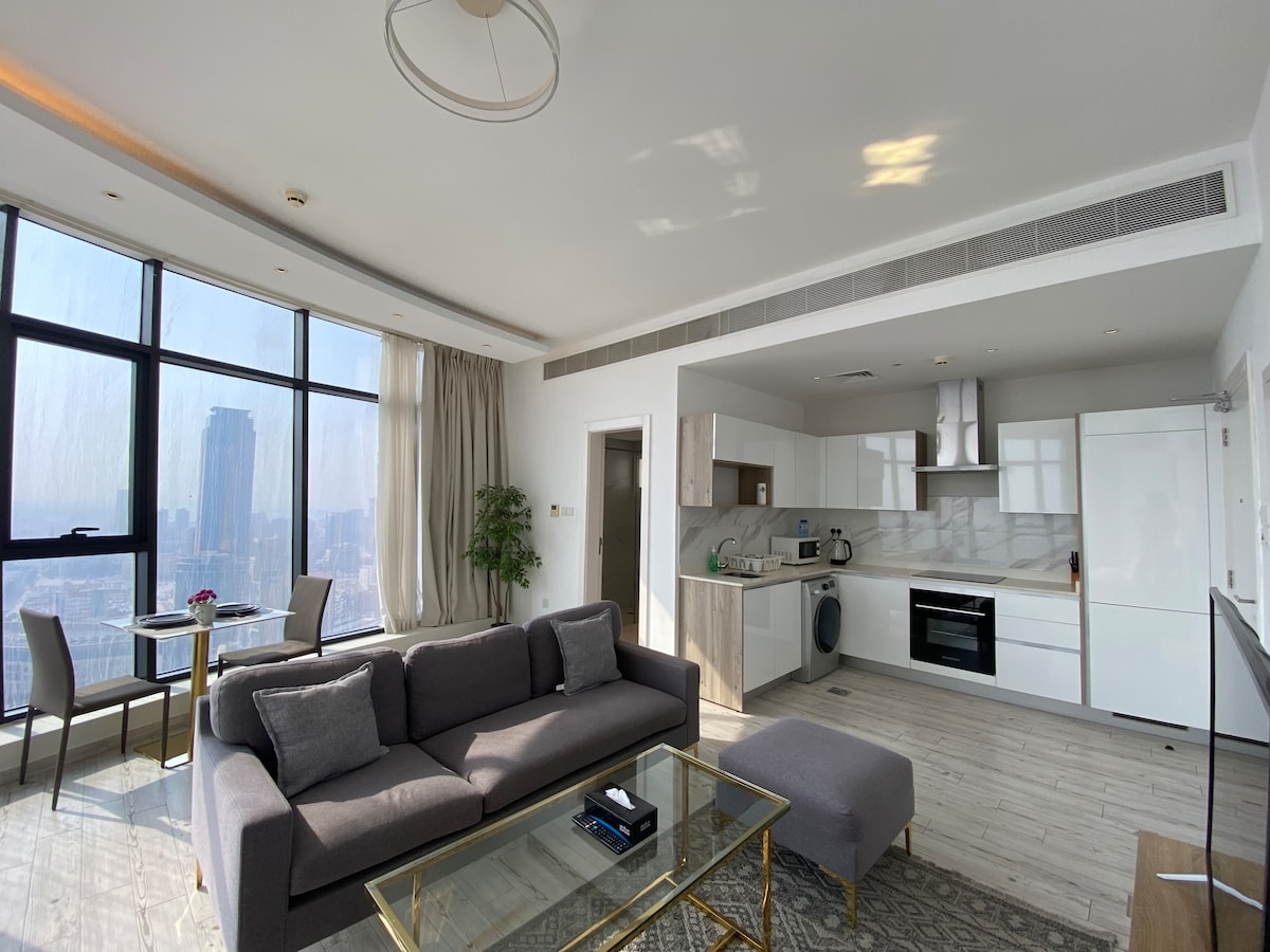 Kick back and relax in this cozy, stylish condo. The Condo 327 is a brand new sea + city view 1BR well-equipped apartment, with two private balconies w/outdoor swing, PS5, two smart TV’s (with Netflix), comfy feathered bedding, high-speed wifi, toiletries and fully-fitted kitchen on the 32nd floor of a gorgeous newly-built and secure building. Full access to all amenities; - Fitness center - Swimming pool - Sauna - Cinema - Squash court - 24/hr security.