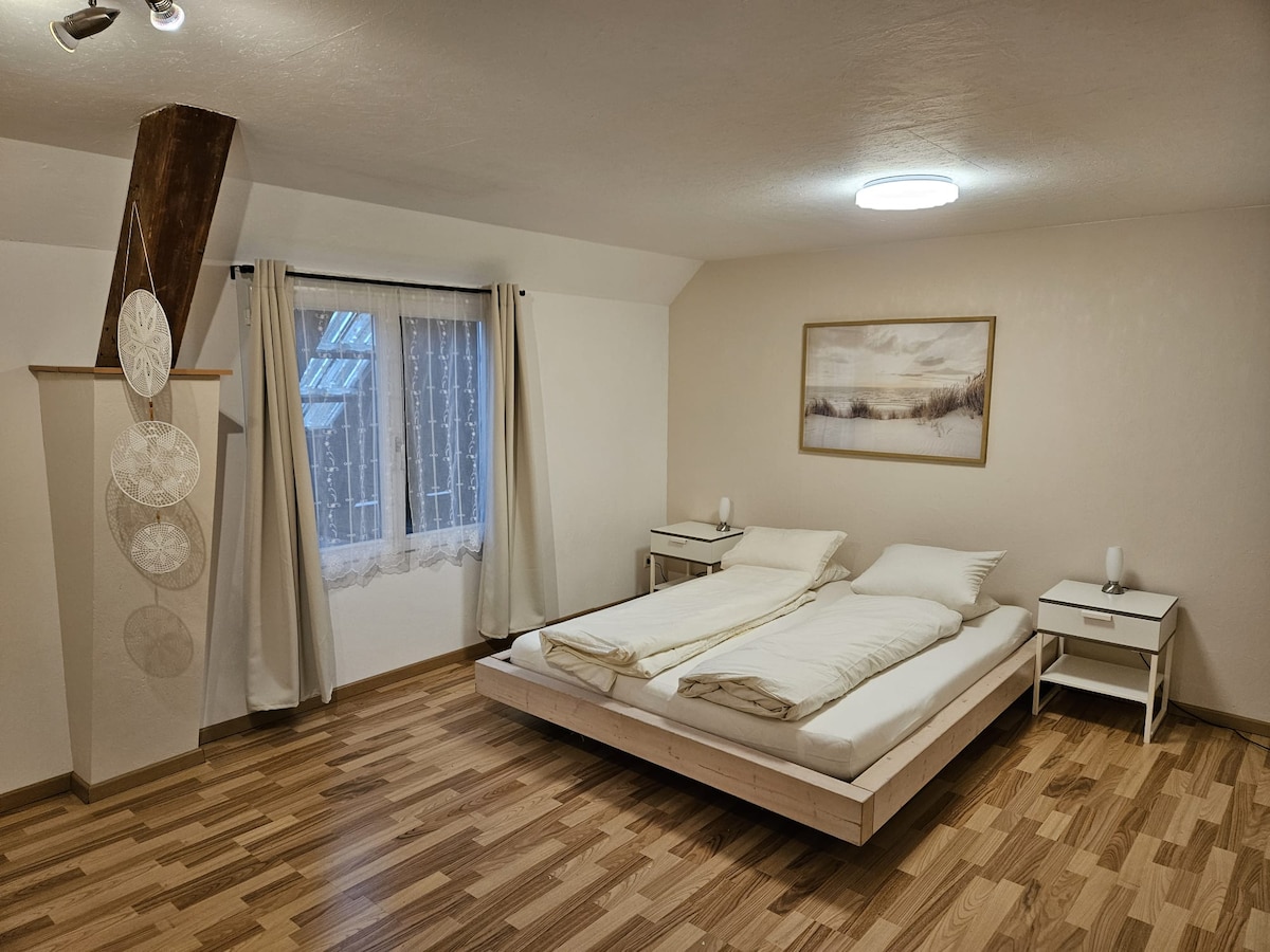 Perfect for families, friends, or a romantic getaway. Enjoy a cosy queen bed, 2 single beds, a couch, garden. The suite is on the 2nd floor, with a private bathroom on the 1st. Explore with our bikes, relax in the garden with mountain views, and savor nearby lake activities. Optional services include airport transport, breakfast, Swiss cuisine (Fondue / Raclette). Family-friendly, sport enthusiast & musical vibes!