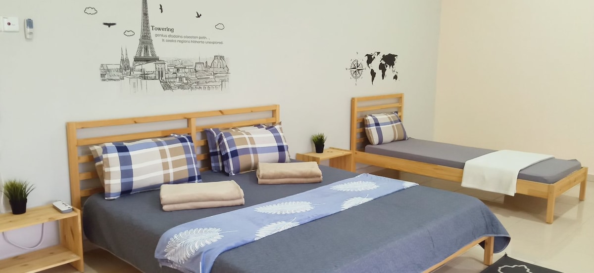 Enjoy a cozy homestay at Bandar Putra/IOI, a new home, that is roomy, tidy, and clean for family gatherings (10 guests) during staycation. MUSLIM-friendly features, 4 comfortable bedrooms (2 with air-conditioning + 2 fans), a living room with air-conditioning, and a prayer area. The kitchen is equipped with all utensils for cooking. Take advantage of rapid access to more venues, Bandar Putra Mosque, Bandar Putra Hall, SJK(C) Jagoh Hall, UiTM, PULAPOL, Kolej Komuniti Sgmt,SM Sains, and many more.