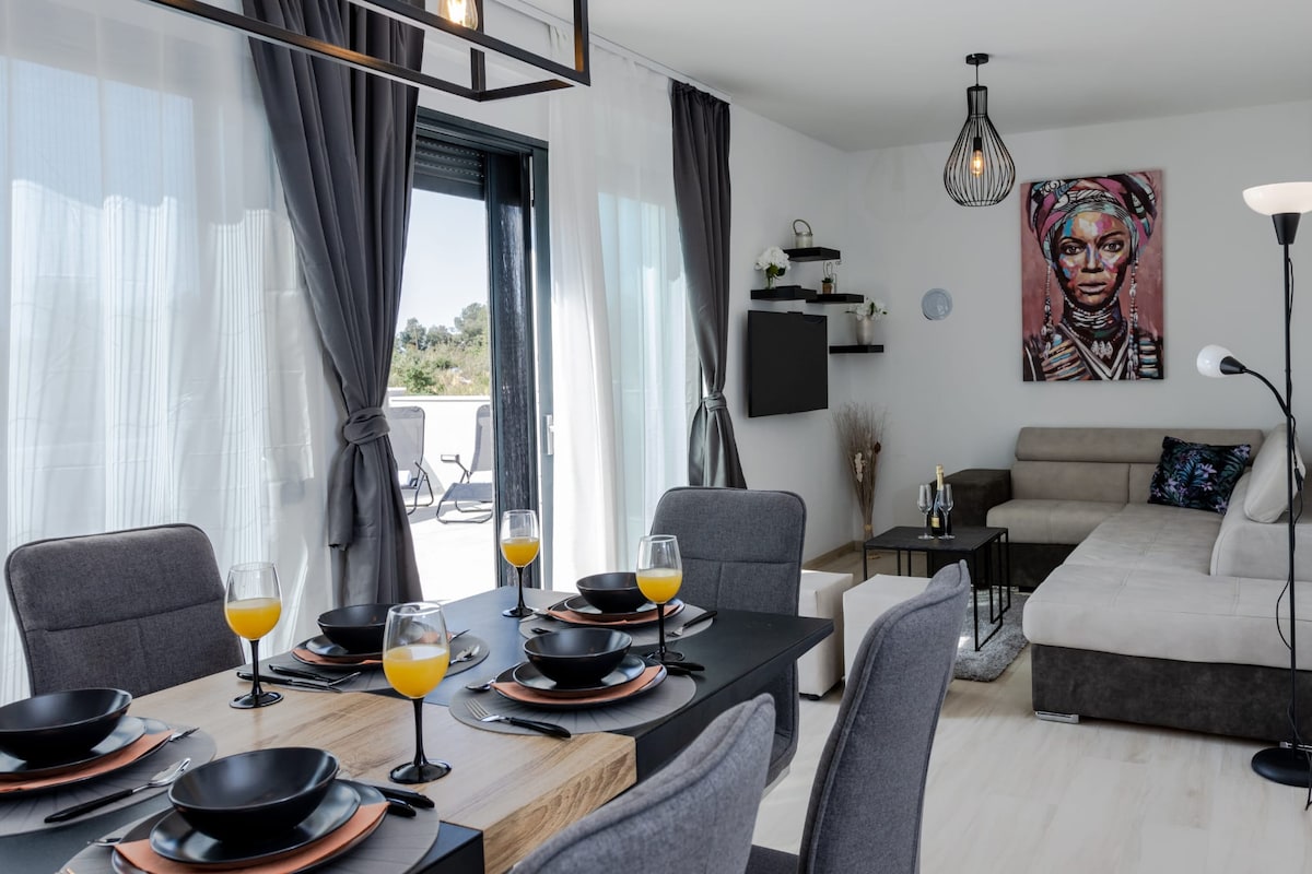 Royal is new, modern & luxury renovated apartment with jacuzzi, 50 meters away from beach. Has 50 square meters and 30 square meters terrace. Comes with 2 bedrooms, a living room, a fully eqipped kitchen with a dining area, bathroom with great shower, barbecue facilities, garage(1 car) , flat-screen TV in every room and free wi-fi. Offers a big terrace with open sea view on surrounding islands. Diving can be enjoyed nearbly. Trogir is 5 km away and Split airport 8 km from the acommodation.