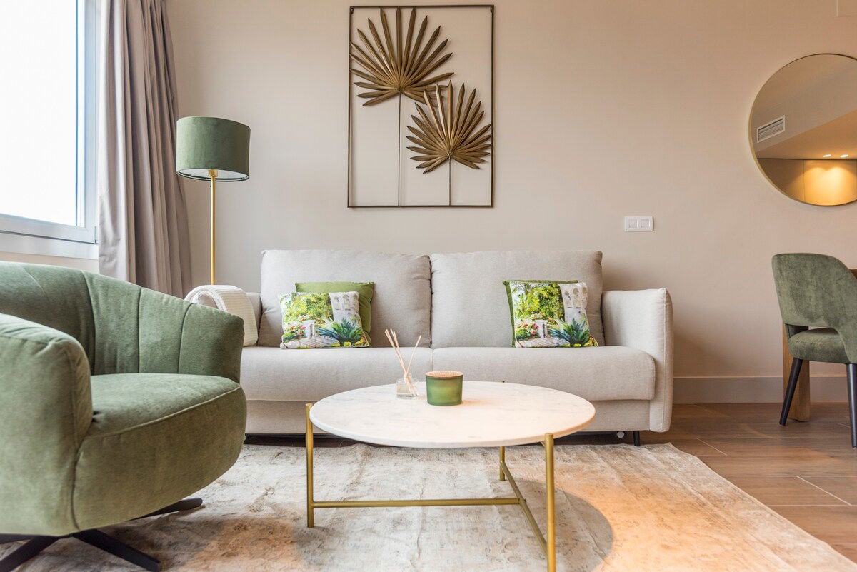 “Vine” apartment is located in Madrid center, off Gran Via, on a quiet street in a new building with elevator. It is nature-inspired, bright & modern, has WiFi, is fully equipped and is very close to restaurants, tapas, the Metro, shops & galleries. Best for a single, couples or couples with a kid! Pets are invited happily!!! The apartment is located in a new buliding, with an elevator! It is modern designed, with lots of greenery, themed to its name, Vine. A huge window along the length of the whole apartment overlooks a beautiful private garden. The apartment consists of a bedroom with a double bed, a living area with a single pull-out sofa, kitchen and bathroom. It has WiFi and is fully equipped, including a washing machine, TV, air conditioning, and Nespresso coffee maker - all just ready for your comfort and enjoyment! The apartment is a studio open space apartment - and it's all yours to enjoy! There are no areas in the apartment that you cannot use or access! We love hosting, but also respect our guests' privacy! We are here for you as much as you would like! Located just off Gran Via in lively buzzing Malasana neighborhood with its great range of authentic cafes, tapas & bars. Huge Zara Primark & Mango are minutes away. Best Madrid sites like Royal Palace, Puerta del Sol & Museums are in walking distance The Central Metro Station Gran Via is a 2 minute walk from the apartment. From there you can take the metro to anywhere you want in Madrid and also to all the train stations that will take you out of Madrid to the rest of Spain. If you come by car, a big parking lot is located at Barco 1, Madrid, just a minute from the apartment. There is also a bicycle-rental station close by. A hosting kit of water, soda, milk, coffee, tea and sweetners will be waiting to welcome you :-)