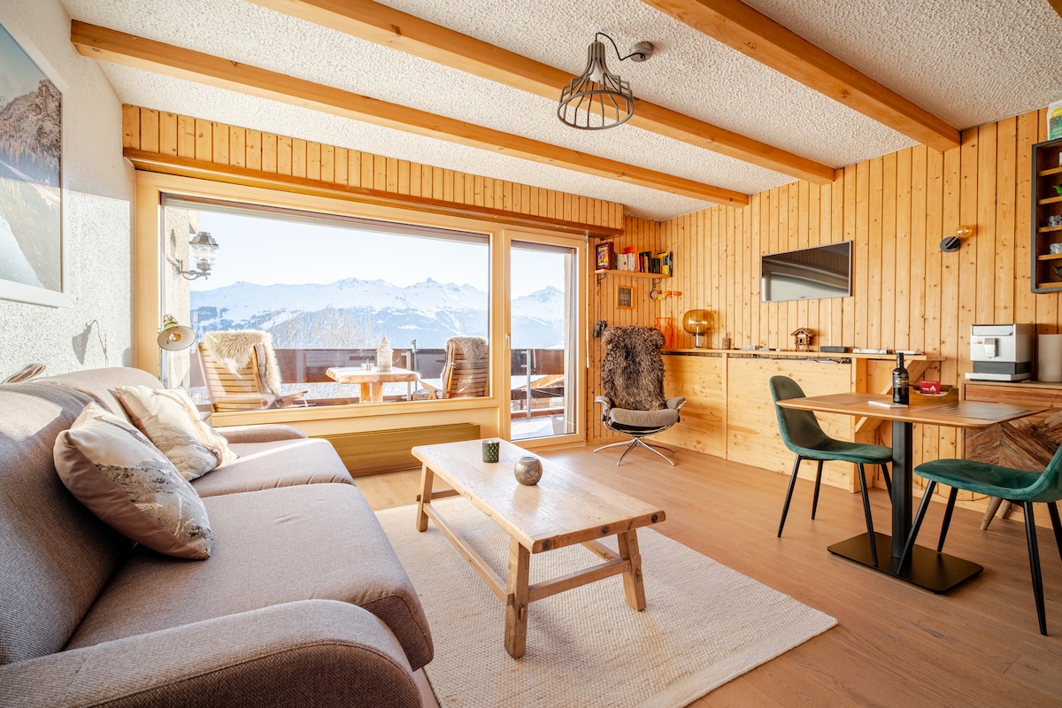 Tel un chalet, ce magnifique appartement offre une vue imprenable sur le Mont Blanc Avec ses 3 chambres, il accueille confortablement jusqu'à 7 personnes. Le grand salon avec sa cheminée est parfait pour des soirées chaleureuses en hiver La salle à manger est également très jolie avec une belle table en bois et la cuisine est équipée pour préparer des bons repas Une excellente option pour des vacances à la montagne en famille ou entre amis, avec tout le confort nécessaire pour un séjour agréable