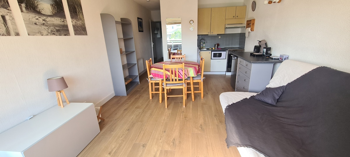 Studio cosy et fonctionnel, entièrement refait, bénéficiant du chauffage pour un séjour même en hiver. Il dispose d’un clic-clac pour deux personnes et d’un lit mezzanine (enfant). Exposé plein ouest, l'appartement offre une vue sur un espace vert et, au loin, les dunes. ⚠️ À partir du 7 septembre, des travaux auront lieu dans la résidence. En raison des nuisances sonores possibles et de l’impossibilité d’utiliser le balcon, une remise de 25 % est appliquée pendant toute la durée des travaux.