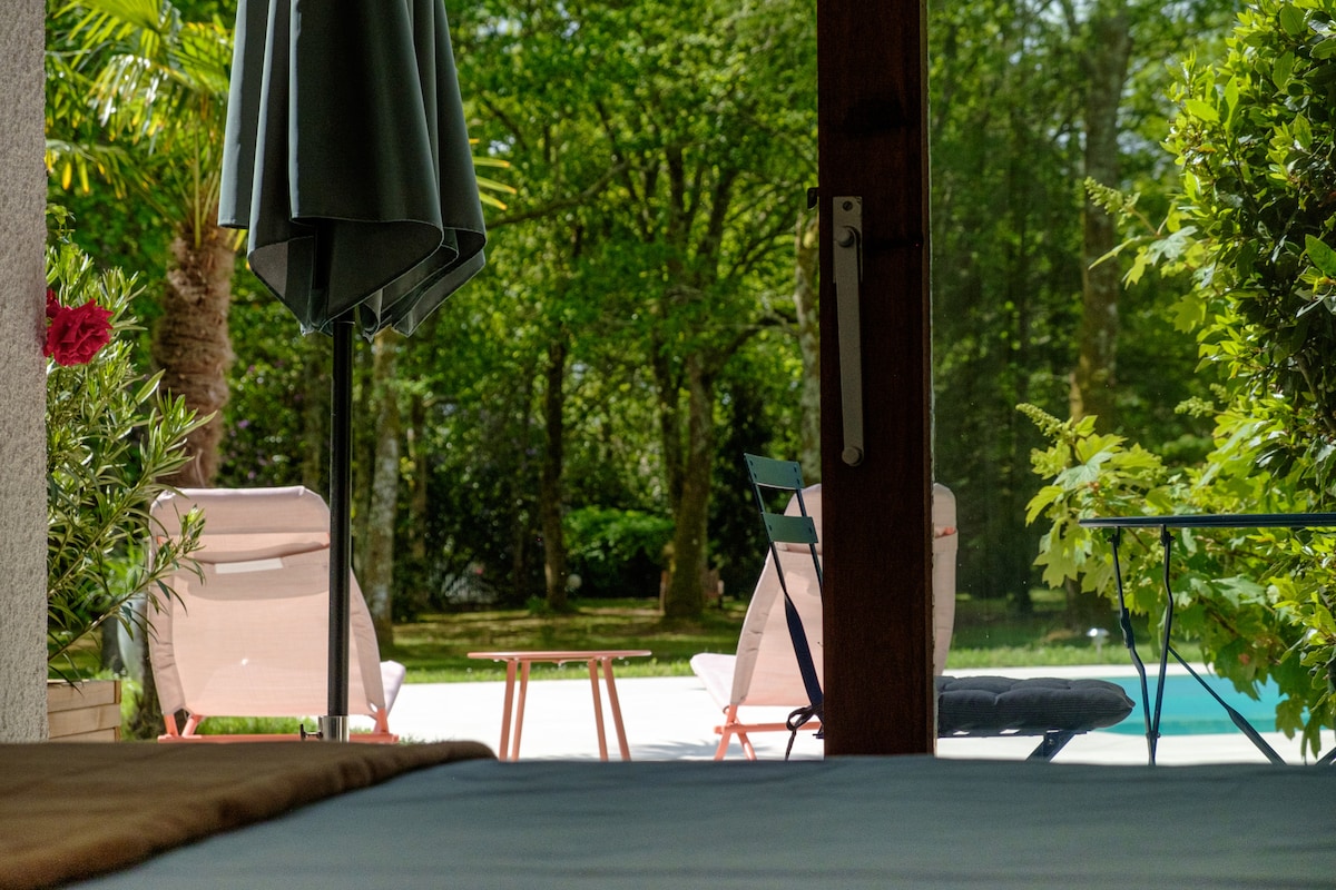 Charmant espace cocooning indépendant, composé d'une chambre climatisée (lit 160), d'un coin salon, de 2 TV, d'une salle d'eau comprenant une douche à l'italienne, d'un espace détente indépendant comprenant un salon de jardin, chaises longues ainsi que le jacuzzi. Vous profiterez d'une grande piscine chauffée de juin à fin septembre. Un copieux petit-déjeuner vous attendra au réveil.
