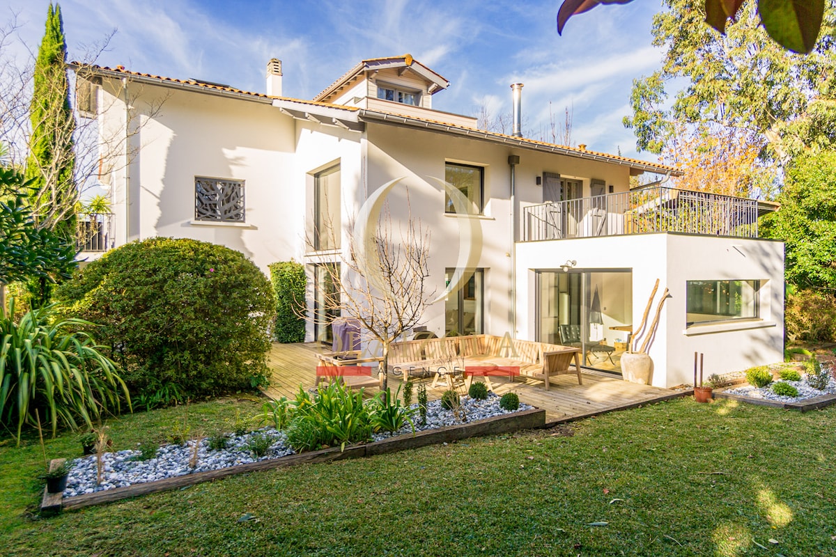 Maison neuve de 100m2 entre mer et golf, très lumineuse , vue sur le golf de Biarritz , spacieuse avec deux chambres se situant à cinq minutes à pied de l'océan, où vous pourrez dîner dans de nombreux restaurants. Commerces en bas de la rue. Parking et jardin de 3500m2 ambiance balinaise/ japonaise avec transat, coin tchill, barbecue , brasero ...ambiance zen garantie :)