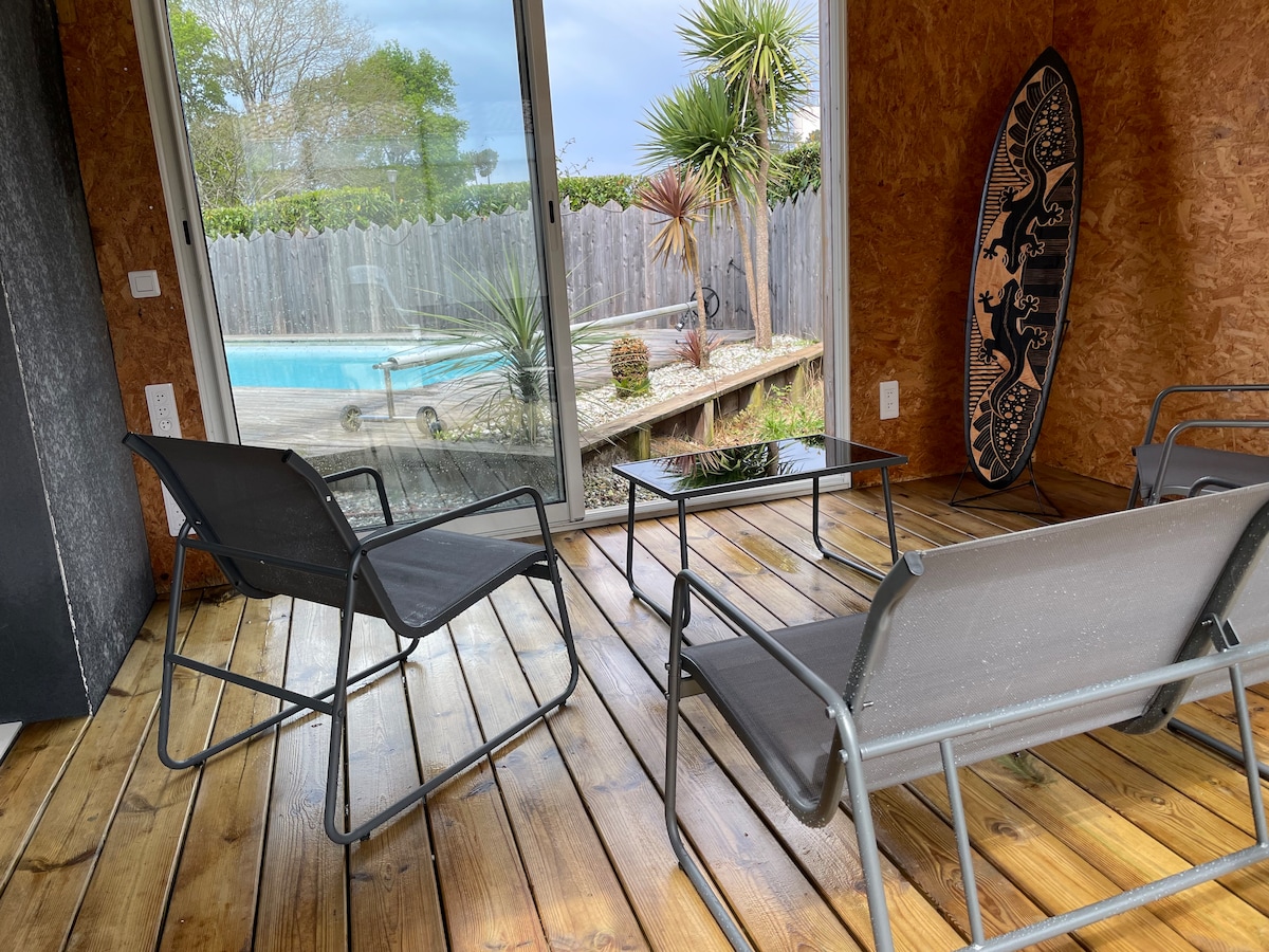 2 bedroom new house of 40m2 under pine trees with a private garden. 800m from the beach and close to cycle paths through the forest that bring you north to Capbreton or south to Ondres. Access by a shared path. 2 bedrooms that can each be left with king size beds or split into 4 singles. Functional Living room/kitchen with all amenities and and a gas griddle for outside cooking. Eat dinner outside on the Patio and then take the aperitif on the sofa under the trees.