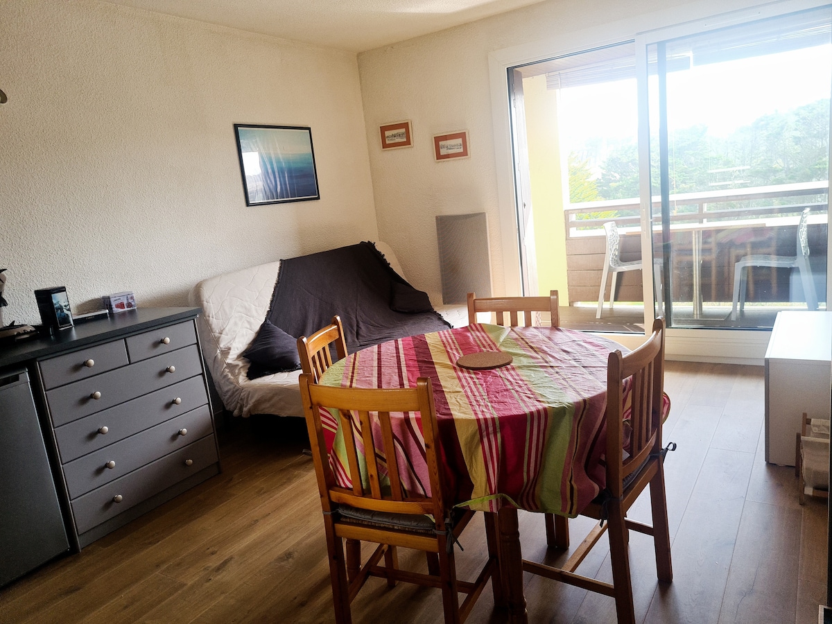 Nice and spacious 30m2 studio and 5m2 loggia/terrace, double exposure East and South, quiet overlooking to the pine forest, second floor without elevator of a small residence. Beach, shops, market and entertainment 100m from the apartment, hundred of free car parks available closed to the building, where you can park your car, it is the insurance of holidays without a car closed to the best european beack breaks and surf spots ! Keep calm and speak in english ! I'll answer all your questions !