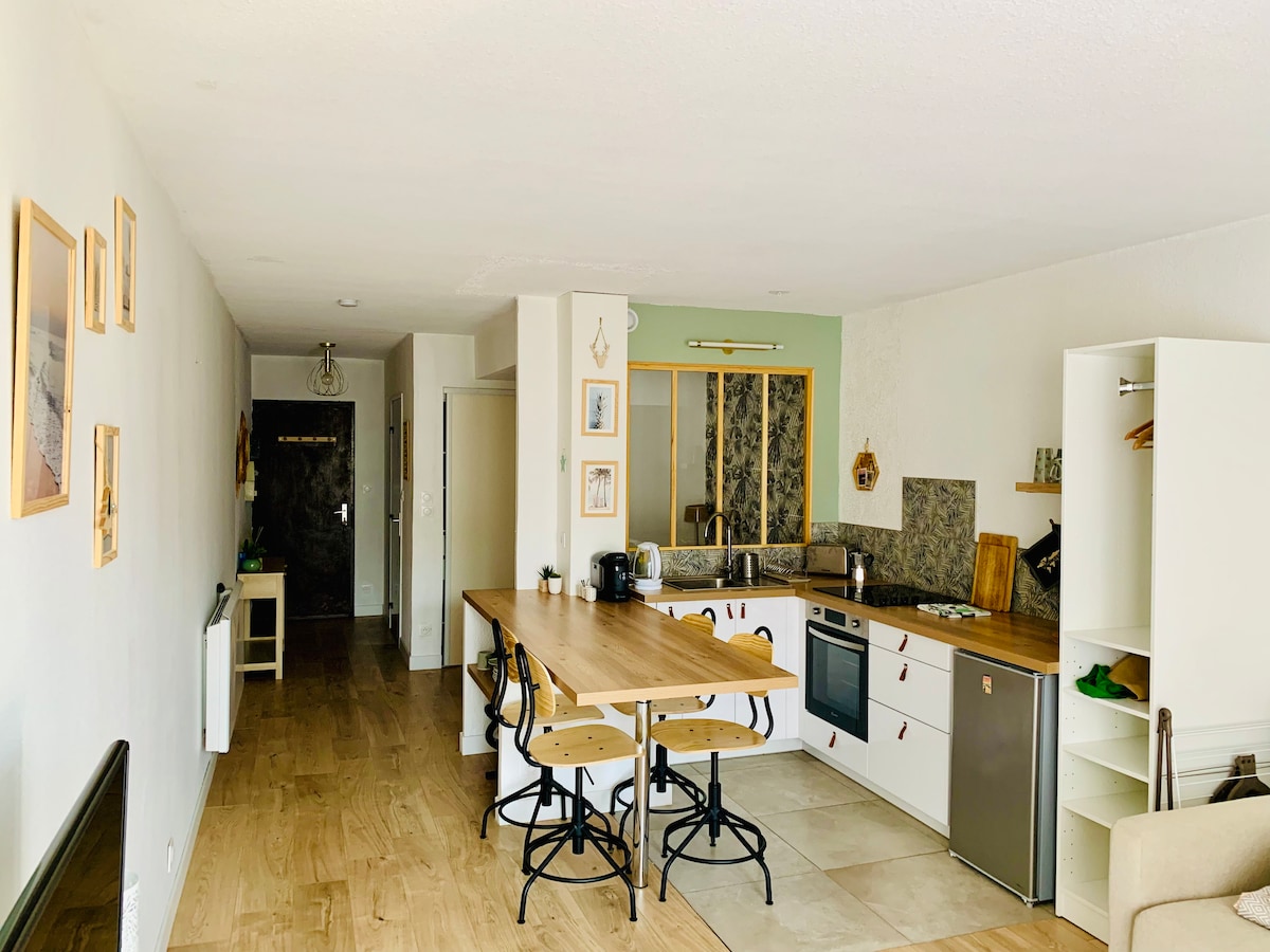 Appartement entièrement refait à neuf en rez de chaussée. La résidence donne sur la plage de l'agreou. Cuisine équipée complètement, même un lave vaisselle. Salle de bain en béton et acacia. Chambre alcove en bois flotté. 4 couchage avec le clic clac dans le salon. L'appartement benificie d'une jolie terrasse et d'une grande pièce de vie Mis à disposition d'une place de parking et de 2 vélos. Proche de toutes les commodités du penon. Très bien situé et facile d'accès.