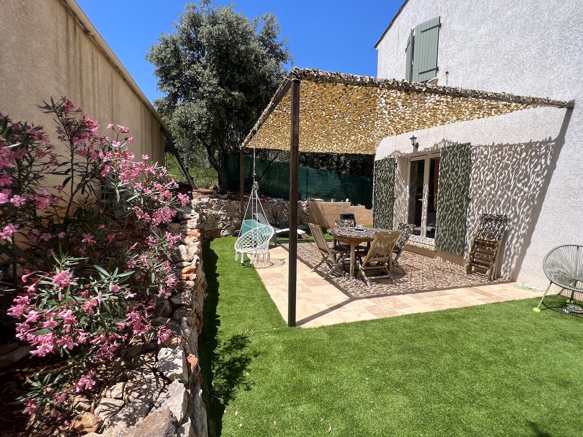 Nous vous accueillerons dans notre jolie villa provençale de 105 m2 sur un terrain clos et arboré de 1500 m2 avec piscine 7m×3,50m chauffée utilisable à partir de mi-avril si le temps le permet. Elle se compose de 2 chambres et de 2 salles de bain. Cuisine équipée ouverte sur le salon séjour. Le séjour avec TV (CANAL + et Netflix) est climatisé et la wifi est incluse. Un vrai petit coin de paradis au calme. Au coeur de la campagne provençale, idéal pour la randonnée ! Villa que pour vous .