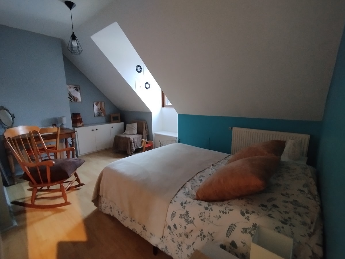La maison donne sur un jardin avec une grande terrasse où vous pourrez vous reposer ,la fenêtre de la chambre donne sur le jardin . grande chambre de 35 m2,salle de bains avec baignoire retro,un wc. L'entrée est indépendante,avec serrure .La chambre est située au premier étage ,acces par un escalier en pierre. Pour les voyageurs le désirant,possibilité de dîner pour 25 euros tout compris.A préciser lors de la réservation. Petit dejeuner offert. lave linge +seche linge 5 euros pour le GPS :wase