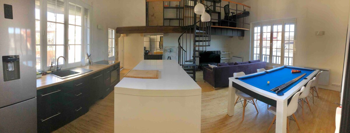 Dans ce petit hôtel particulier, nous vous accueillons dans un loft de 90m2, chaleureux et confortable au 2ème étage(escalier un peu raide pour des pers. à mobilité réduite). Ce loft dispose d'une chambre individuelle avec un lit deux pers.(140), une grande pièce principale avec : un lit deux pers.(140) ,une salle à manger, une salle de bains, une cuisine aménagée, des wc indépendants. Le linge de toilettes et lit sont fournis; possibilité d'ajouter 2 lits d'appoint d'une pers. TV ,wifi, clim.