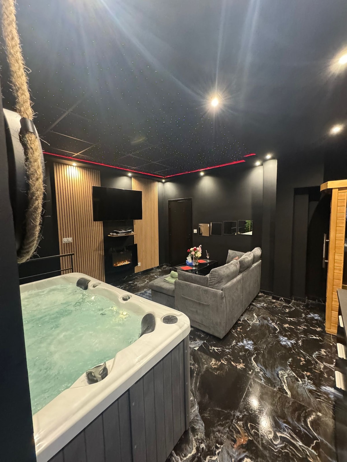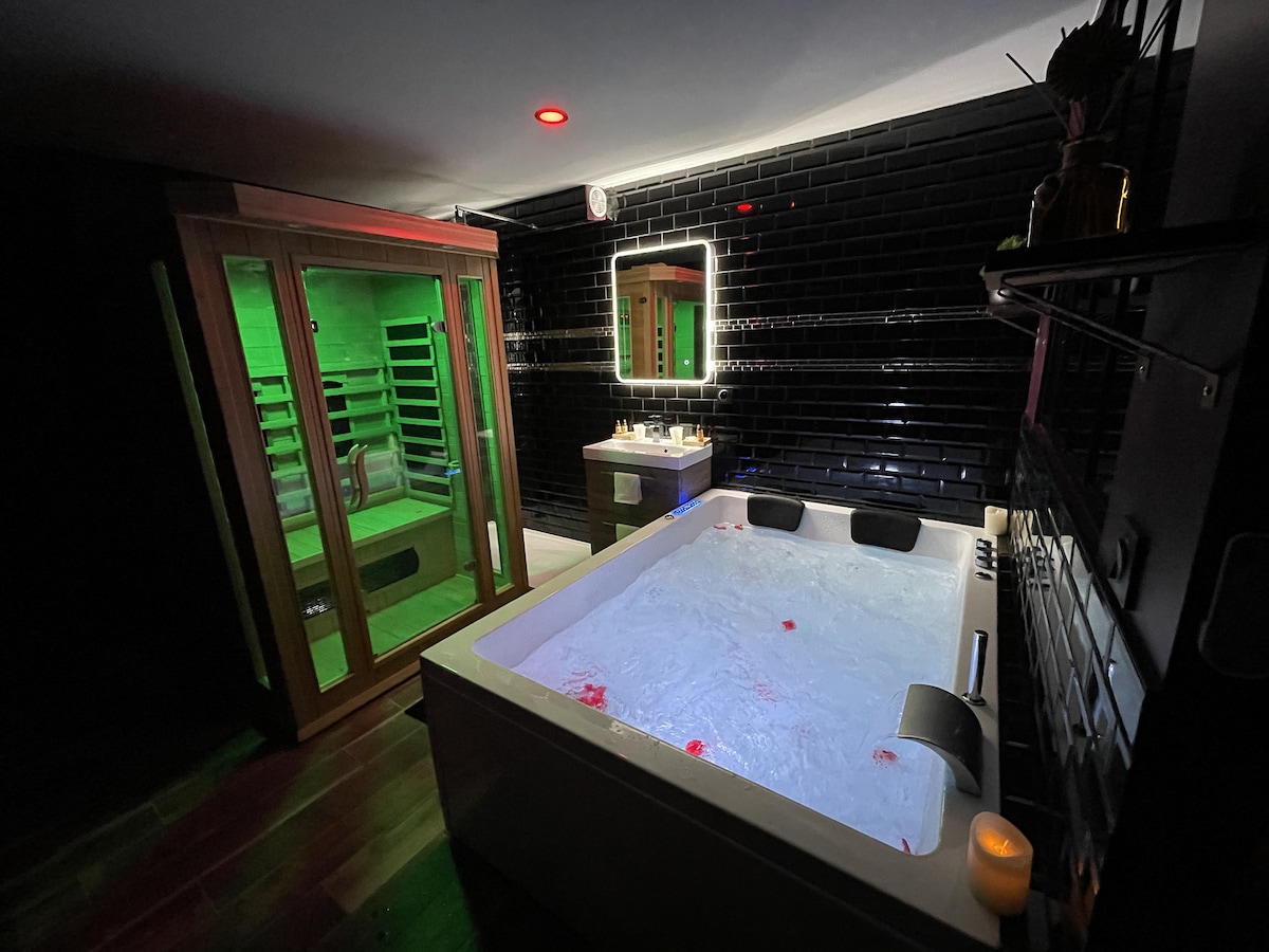 ❤️🔥 Discover the luxury Love Room VELVET & LEATHER at 20min from Paris, perfect for a romantic and sexy getaway ! 💎 Spa bath, private sauna, cloudy-effect king-size bed, stripping bar, tantra sofa, etc. 💋 Explore new sensations and create unforgettable memories together in the incredibly equipped secret BDSM playroom space 🎬 92" Cinema face to the bed with Netflix, Prime Vidéo, Disney+, Spotify 💫 Escape to a haven of peace and luxury for a unique and memorable experience !