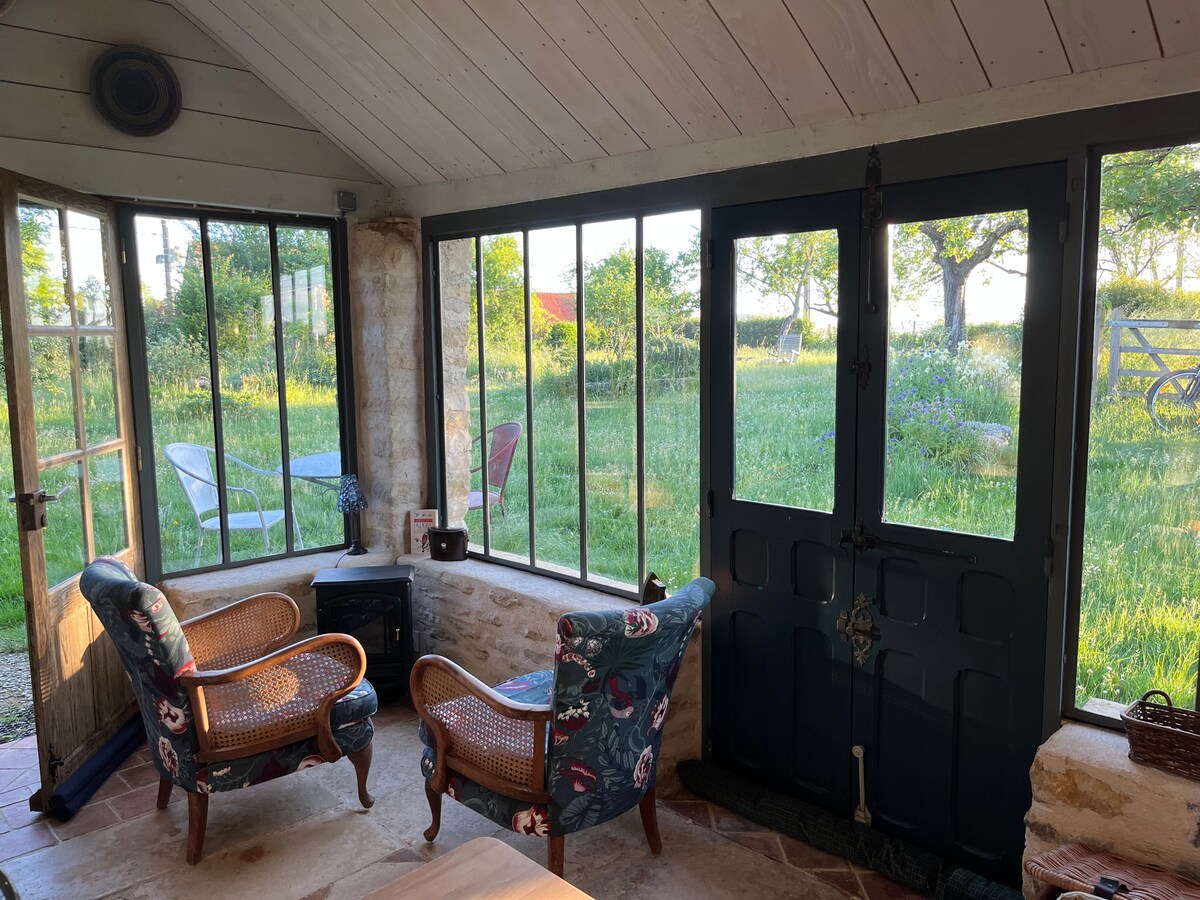 Stunning views across the Auxois countryside from both house and garden. Very comfortable double bedroom with private entrance & ensuite bathroom in a sleepy hamlet. The heated garden kitchen can be enjoyed year round providing simple cooking facilities, dining table and armchairs. There is an area for alfresco meals, a small herb garden & deck chairs to enjoy the spectacular views; off road parking. The owners, Bill and Jenny Higgs live next door - very discreet but always on hand to help.