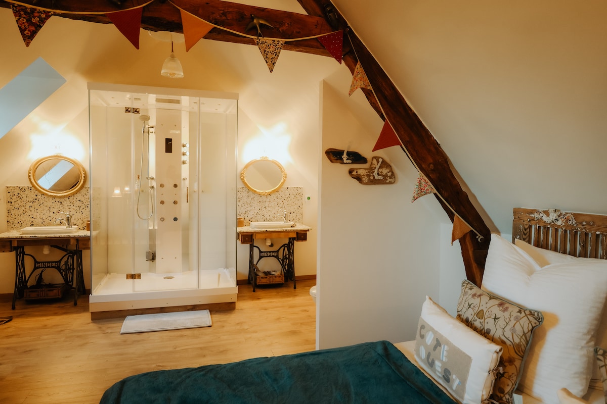 Maison colombage charme et confort ! Au RDC une grande chambre avec douche à l'italienne. Deux chambres à l'étage. Une cuisine américaine, grande cheminée (le bois n'est pas fournis) et vue dégagée imprenable pour profiter du coucher de soleil. Terrain de 2ha avec chevaux aux pieds de la maison. Accès internet Wifi.