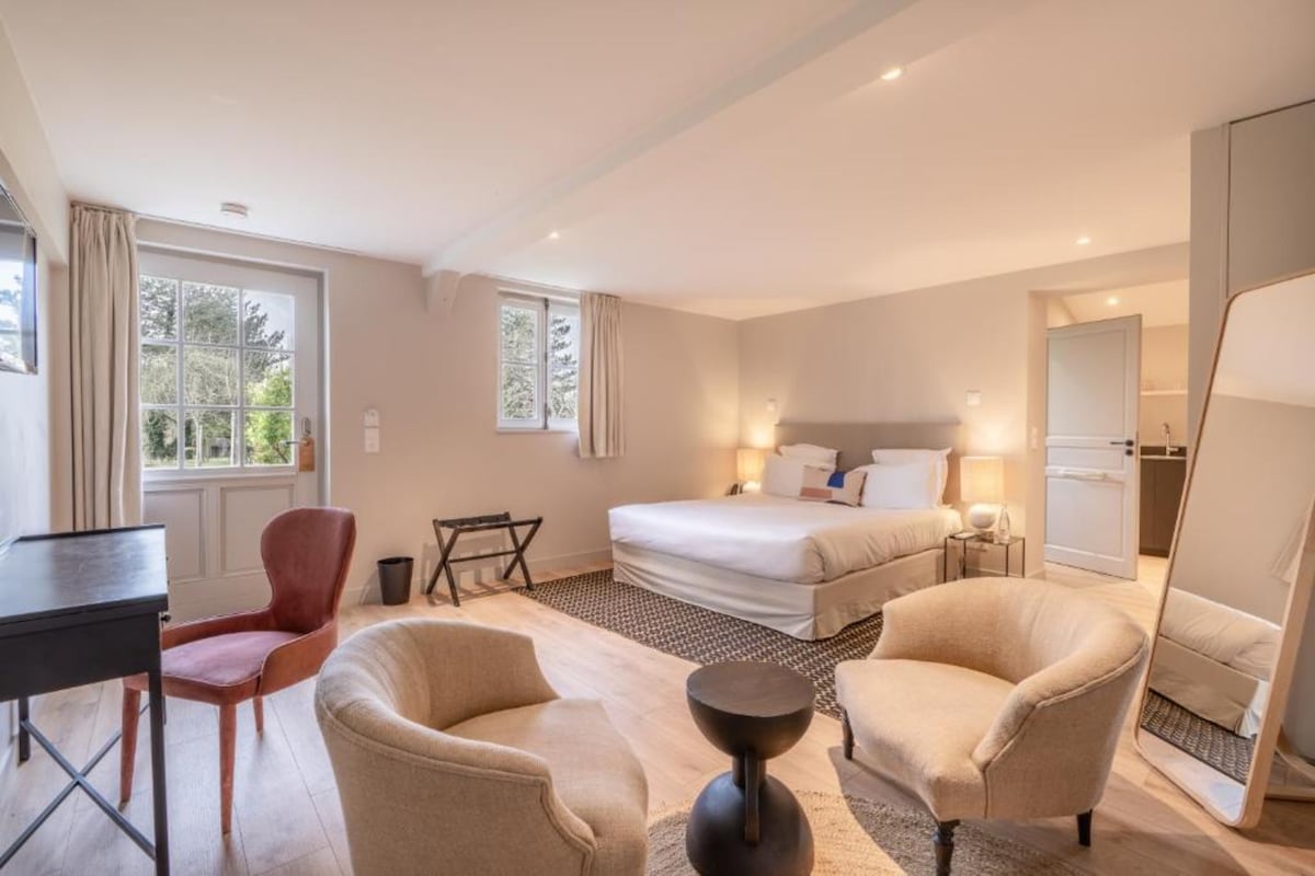 Suite Junior – 25 m² pour 2 adultes et 2 enfants Offrant espace et indépendance, la Suite Junior séduit par son lit 160 cm, son coin salon avec canapé convertible et son ambiance chic et feutrée aux tons noir et beige. Profitez d’un confort haut de gamme : literie de qualité, couette douillette, TV écran plat, wifi rapide, produits d’accueil Algotherm et cafetière Nespresso. Idéal pour un séjour élégant et relaxant à l’Hôtel Le Fer à Cheval, au cœur de Trouville-sur-Mer.