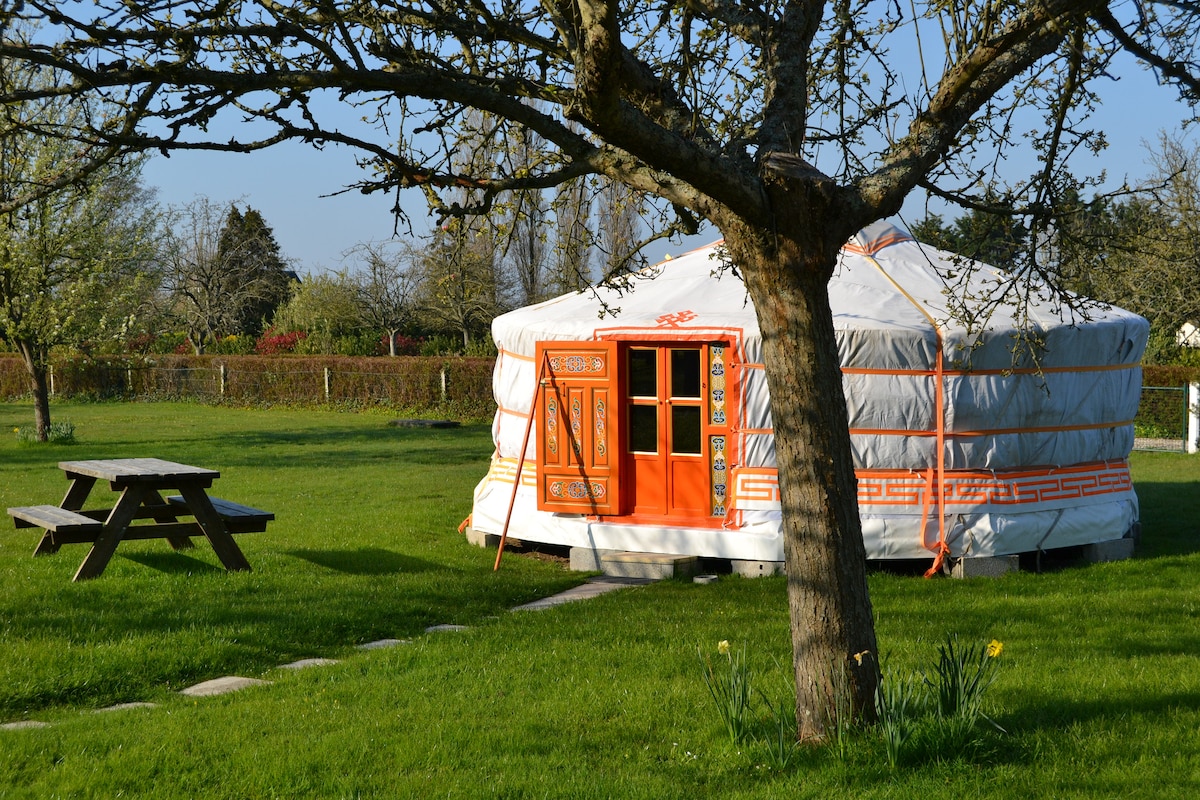 Dans un ancien clos masure, sur un terrain arboré de près d'un hectare, le Courtil vous accueille dans une yourte de style contemporain, entourée de sa terrasse en bois. Isolée de nos logements, vous bénéficiez d'une pièce spacieuse de plus de 60 m2 toute ronde et sans cloison. Elle comprend un lit double, 1 canapé convertible 2 places, un canapé, un coin détente avec son plateau de courtoisie. En hiver, deux radiateurs vous apportent chaleur et confort.