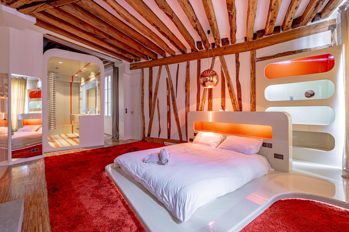 Immerse yourself in the exquisite intimacy of our Experience Red Nest in the heart of Paris. Nestled in a central neighborhood, this luxurious retreat blends Parisian charm with sophisticated modernity. With our courier service and exclusive restaurant recommendations, your getaway promises to be truly unforgettable. Enjoy easy access to public transport (Metro lines 4 & 10, buses, and Vélib’) and the proximity of charming cafés and boutique shops. A perfect haven for lovers seeking romance, com