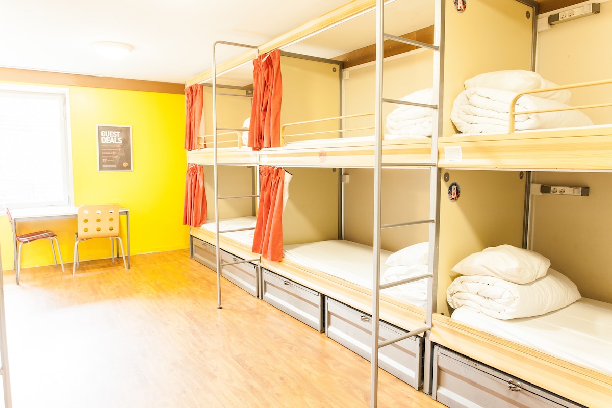 Let's discover our cabin room! This 5 sqm space comes whit a very comfy queen size bed and is the perfect spot for those who want to sleep in a totaly private space. Each cabin includes linen, a USB port, a bedside lamp, a place to store your suitcase and change yourself. The bathroom is shared and a towel can be rented. The room grants access to the Happy House, a social space for inhouse guests only.You will find everything you need to prepare yourself a snack or chill with your new friends