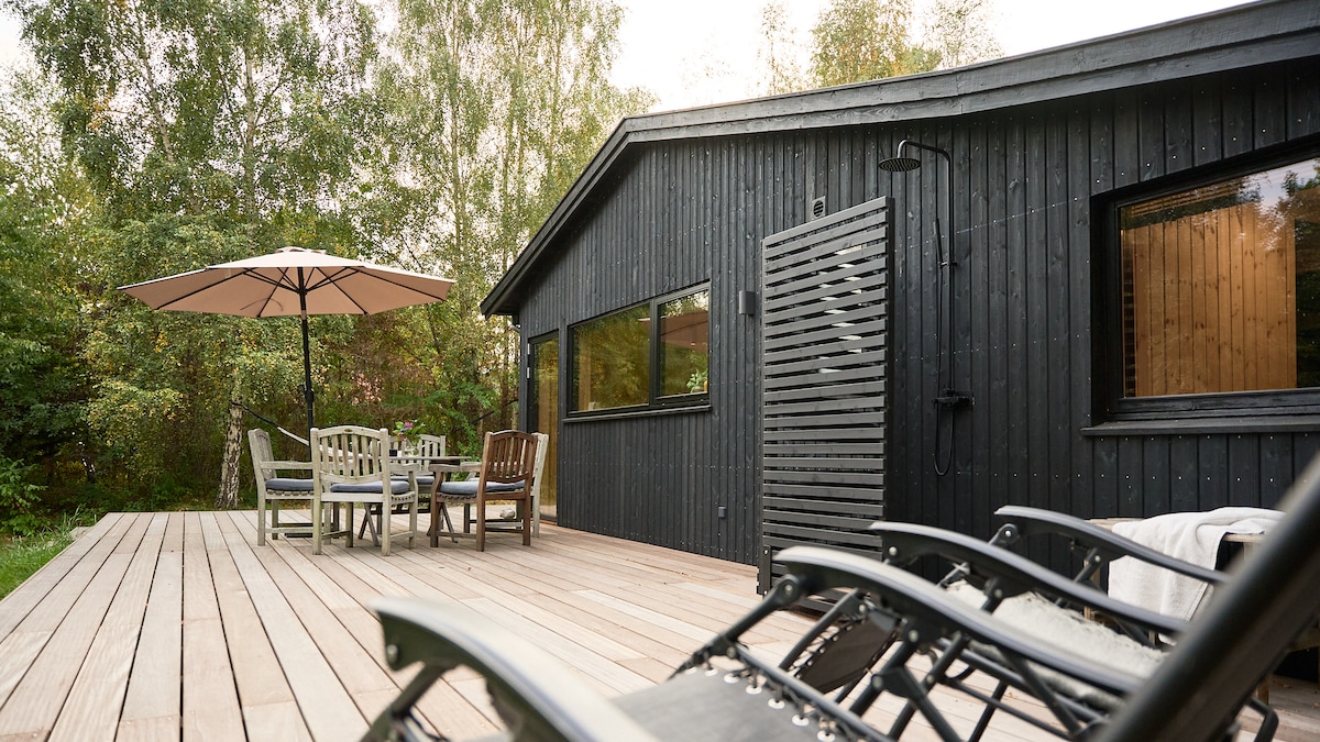 Small wooden cottage located in a big parklike and lush garden, private and separate from the main house, only a few minutes to a large forest, lovely beaches and a charming town with shops, cafees and restaurants, and close to the train. It has one main room with two beds put together, a separate kitchen for simple cooking and a bathroom. The terasse has a roof and is surrounded by flowers, trees and bushes. Suited for a romantic getaway.