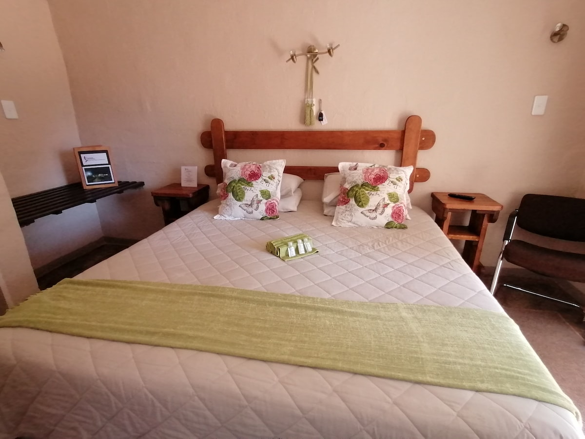 The Chalet has as Double bed and en-suite bathroom with shower only. Its kitchen has a tea and coffee station, fully equipped kitchen with a microwave and stove. The airconditioned unit overlooks the garden, and braai area. All units are loadshedding proof.