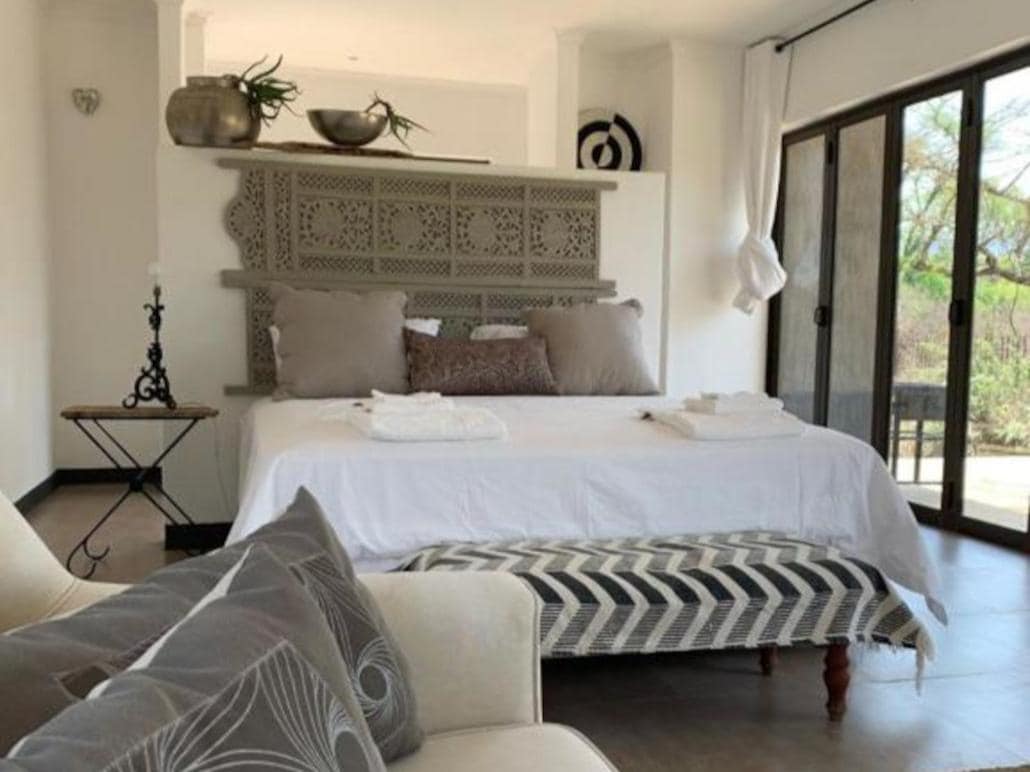 This spacious suite is furnished with a king-size bed, and features an en-suite bathroom with a bath, and an outdoor shower. This room boasts a well-equipped kitchenette, a TV with DStv, as well as a patio with BBQ/braai facilities.