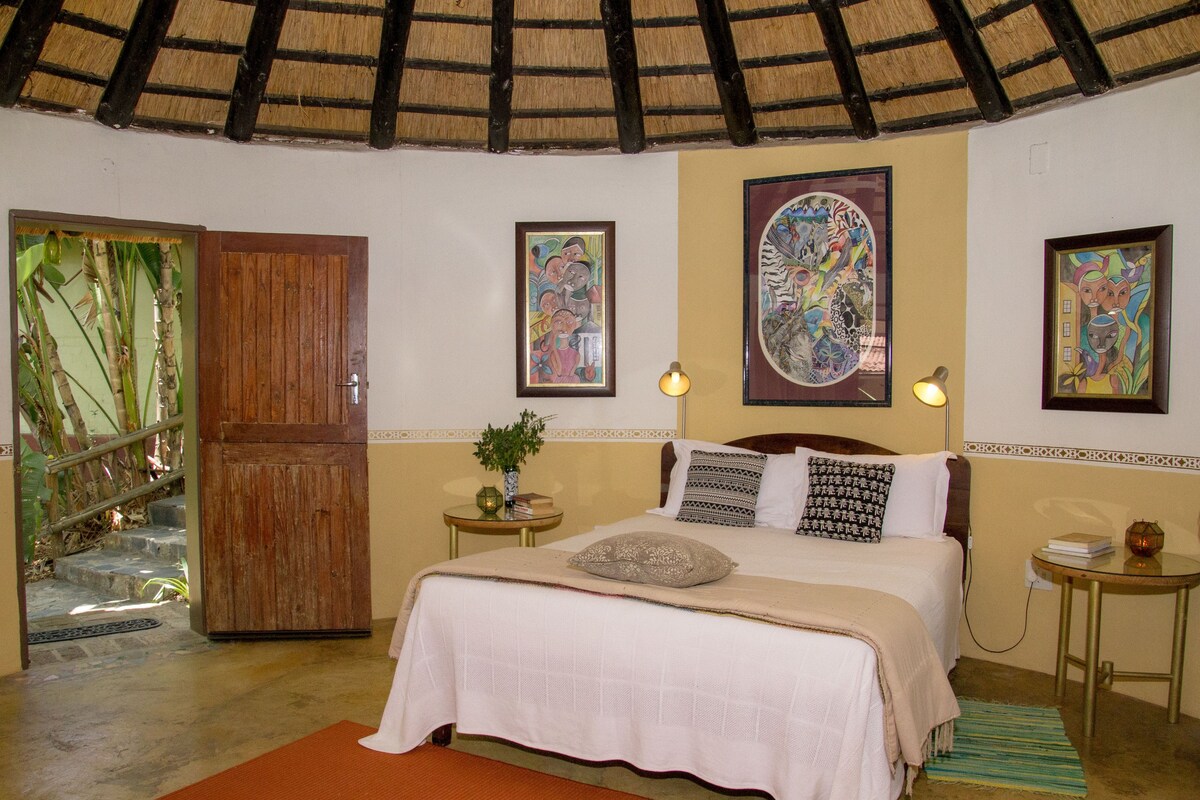 This is the perfect stopover en route to The Kruger National Park, Mozambique or Swaziland. Situated 250kms from OR Tambo airport, 100kms from the Malelane and Numbi gates. Price includes accommodation for 2 guests, breakfast and dinner on request. A traditional round 'hut' with a grass thatch roof. Extra-length queen bed. Bathroom en-suite with tub & shower. Private outside seating area.