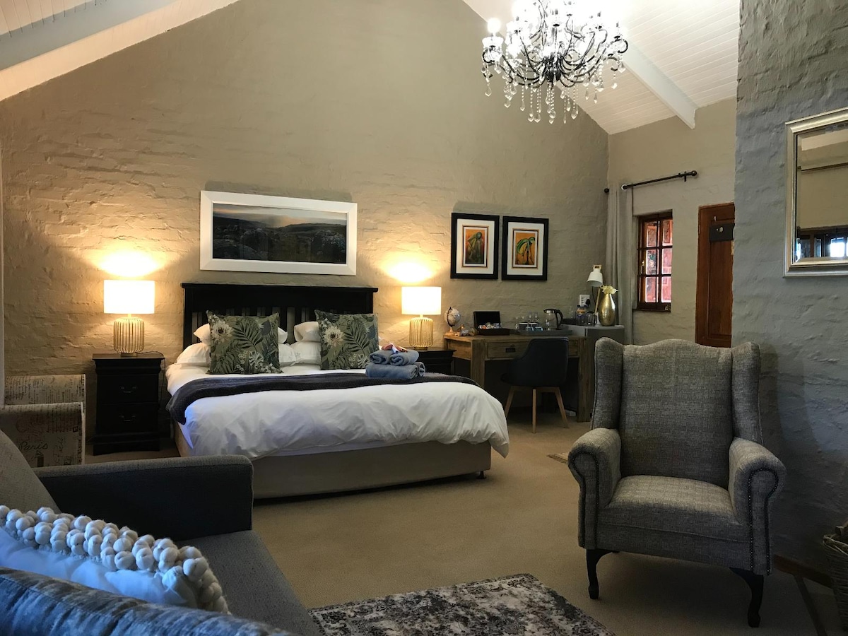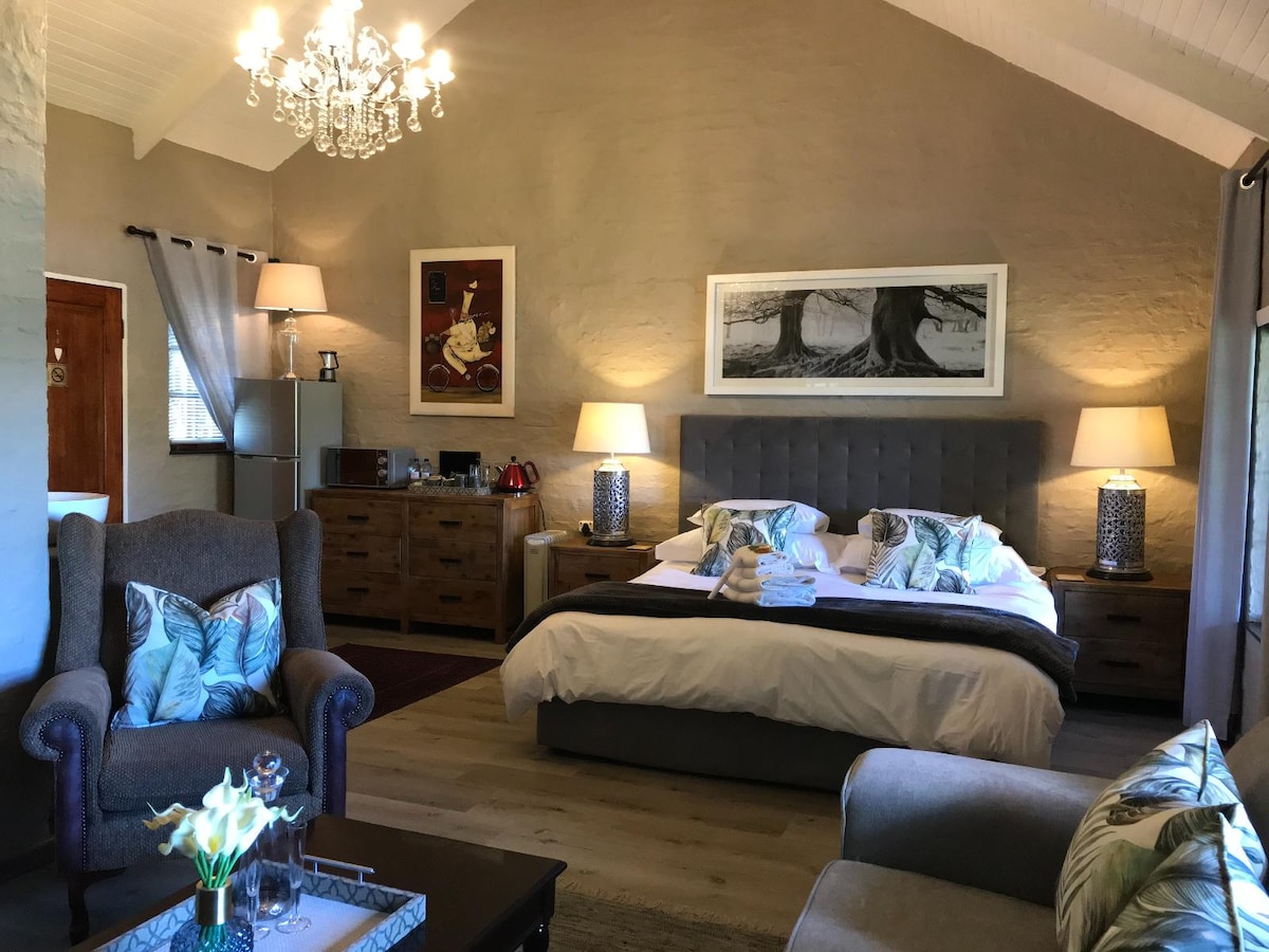 These cottages feature an extra-length king bed (that can split into twin beds) with electric blankets and a full bathroom. Guests can enjoy a fully equipped kitchenette with a 2-plate gas stove, a sitting area with a fireplace, and a patio with a braai.