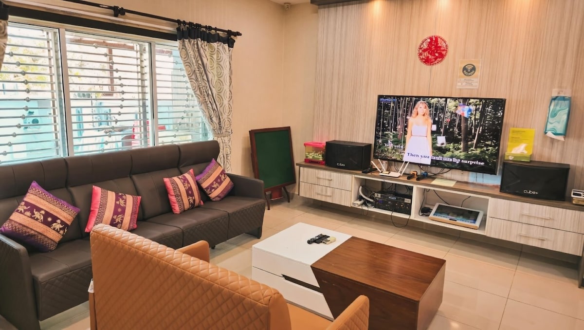 A cozy, modern homestay surrounded by nature. Features a smart, comfortable home with a pool, vibrant greenery, and a thriving farm with chickens, cows, goats, cats, and even a fish pond offering guests a peaceful escape with a touch of rural charm and self-sustained living.