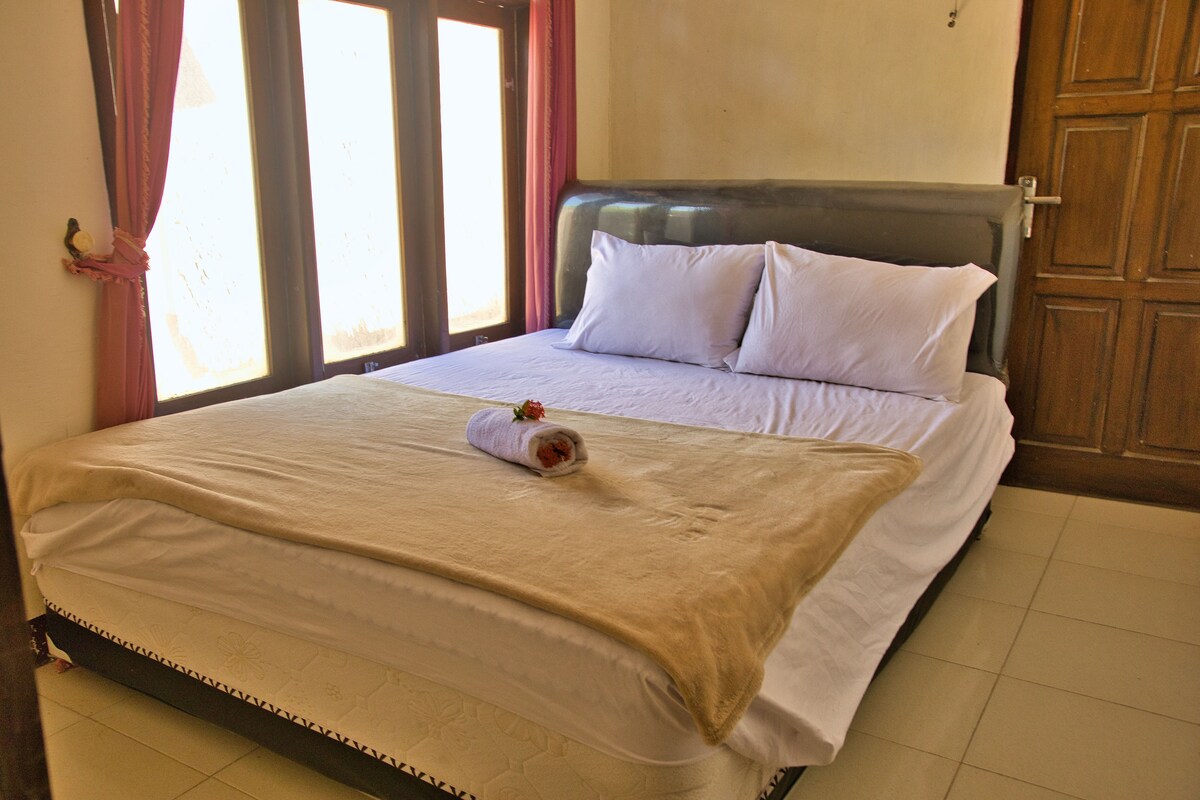100m from Scar Reef beach (Pantai Jelenga). White sandy beach to surf, sunset, swim with calm warm water. Bungalow ideal for 2, can fit upto 4. Room 3x3m, total building 7.5x3m. Huge garden w shared gazebo & BBQ grill Room only, no breakfast. WIFI fair to low connection depends on the weather. AC Beds sheets + Mosquito net Simple Kitchen w Refrigerator Hot water ensuite shower Not provided: toiletries, towel Rp400 nov-mar, Rp500k apr-oct. Add 100k/pax for 3-4th person #scarreef #homestay