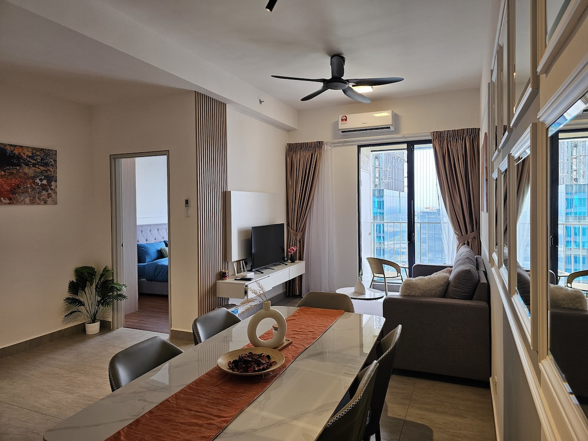 Enjoy a stylish experience at this centrally located place, over looking central i-city mall. We offer a 5 star hotel-feel homestay at affordable price. You'll definitely have a superb experience with free hi-speed wifi and NETFLIX installed at karyaSUITE. Our home is located in the heart of i-City Shah Alam, close to Federal highway, UITM, UNISEL, Jakel and Hospital Shah Alam. Our spacious 759sq ft home accommodate comfortably 6 people in 2 bedrooms.