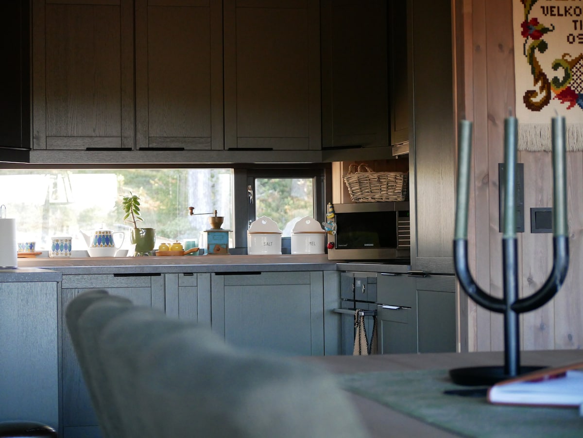 Simple and charming mountain cabin located at the tree line, 1000 meters above sea level. It is only one kilometer from the national park, and it is five kilometers to walk to the Peer Gynt cabin. The cabin has neither running water nor electricity, but it has solar power, which is generally sufficient for charging phones and using lamps. Water is fetched from the stream behind the cabin. There is an outdoor toilet in the outbuilding next to the cabin. The cabin is heated with firewood.